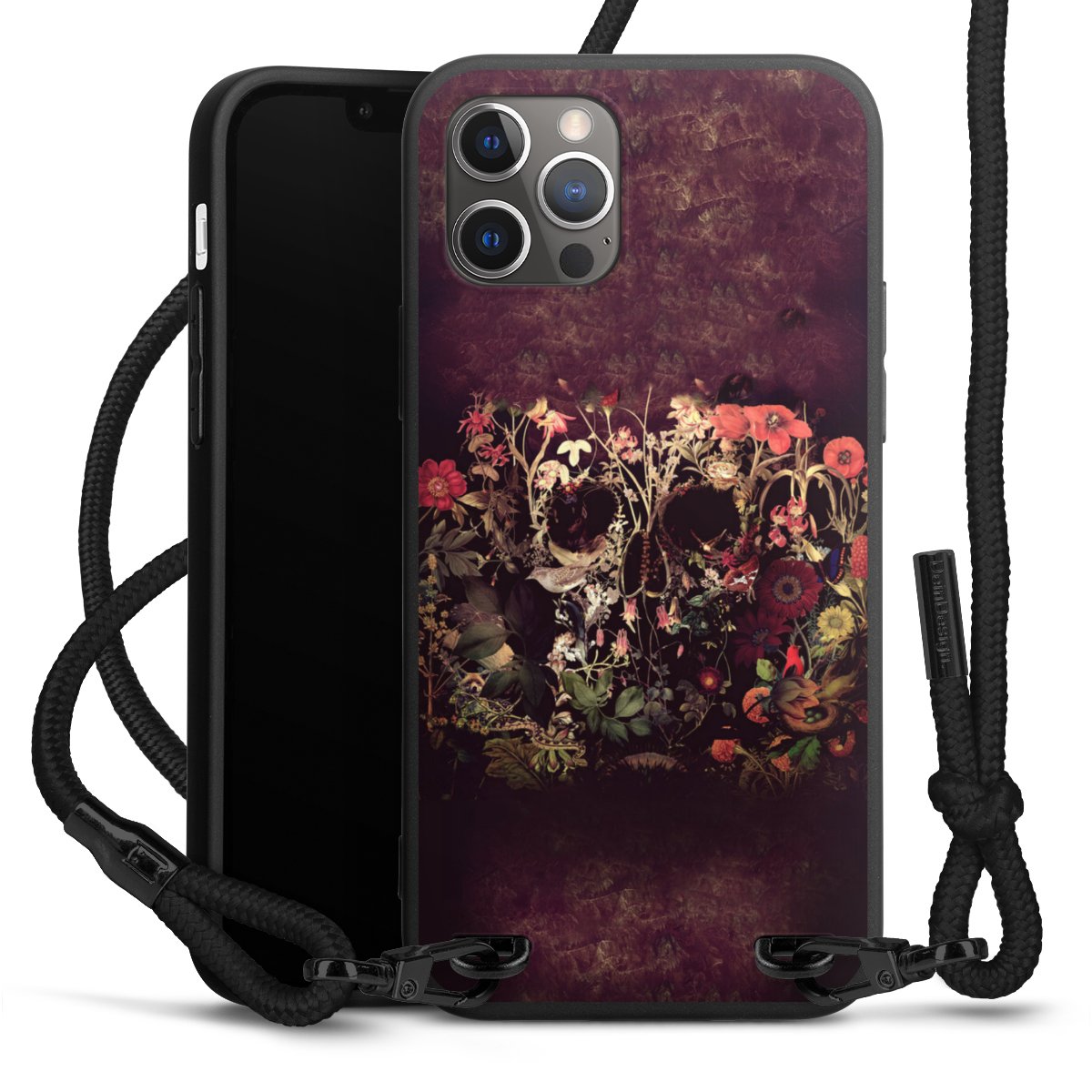 Pure Black: Handyhülle, Stoffband und Metalldetails in stylischem Mattschwarz.