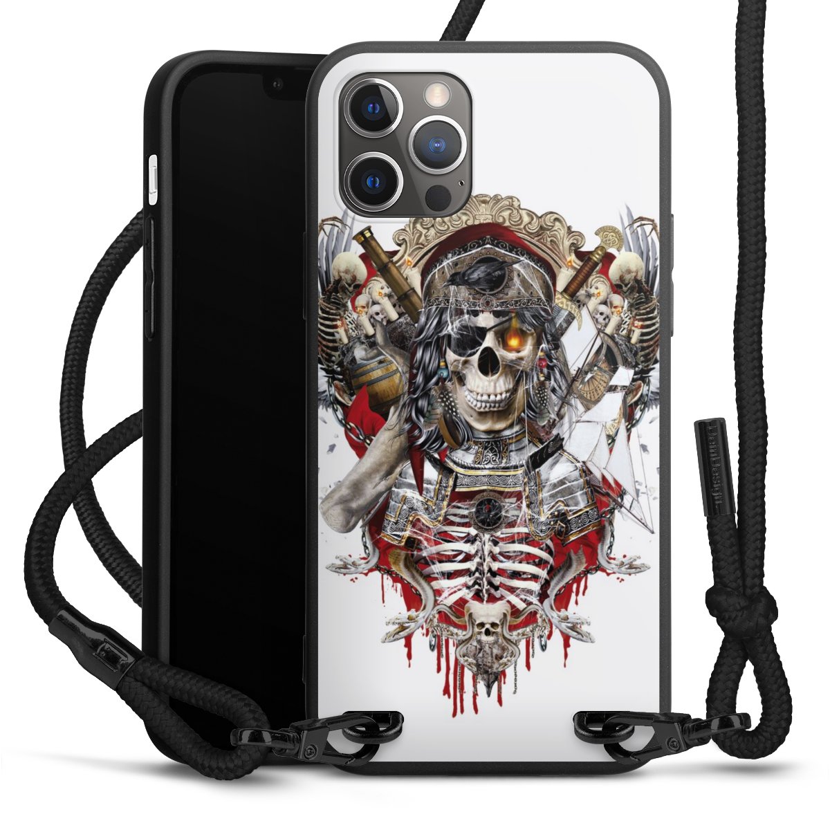 Pure Black: Handyhülle, Stoffband und Metalldetails in stylischem Mattschwarz.
