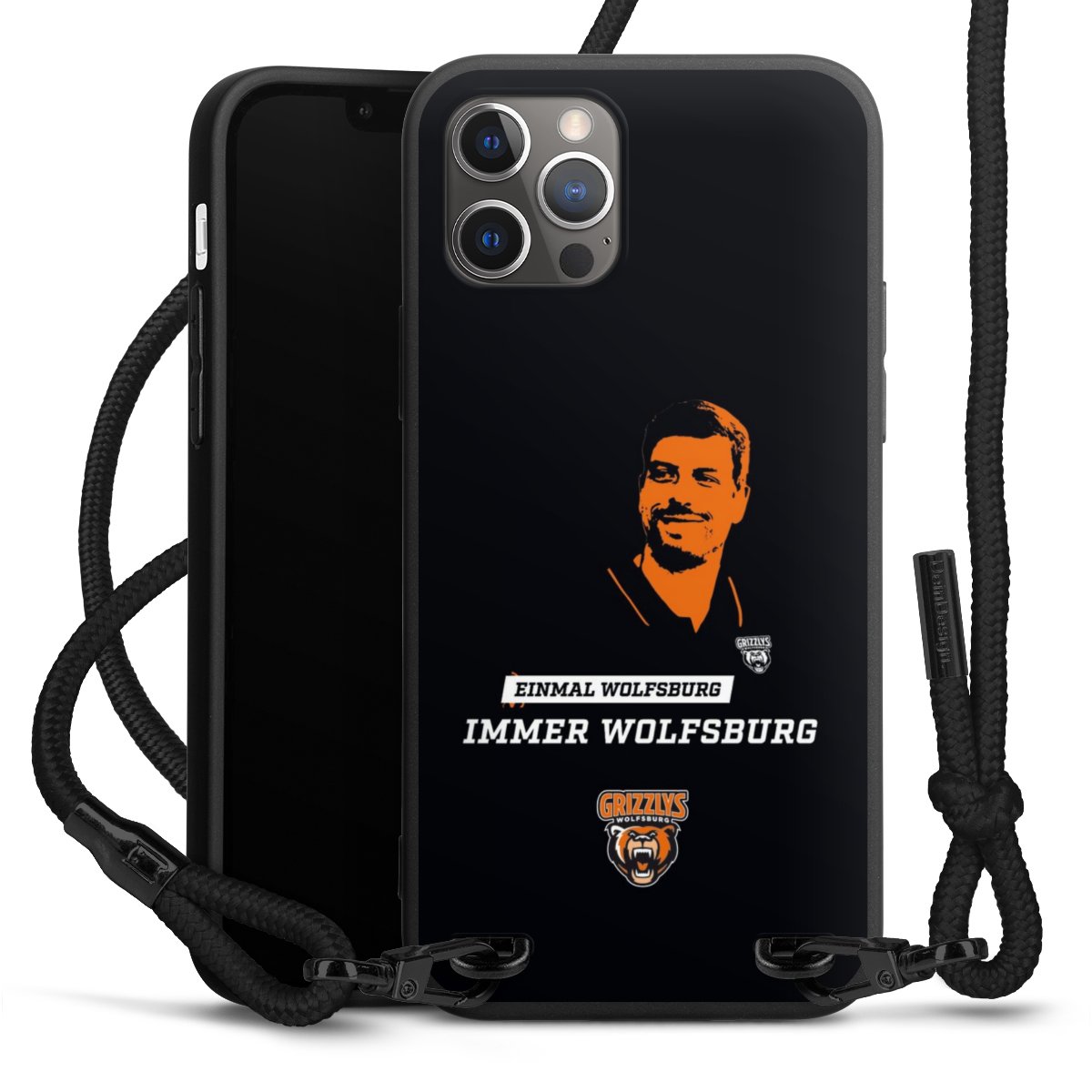 Pure Black: Handyhülle, Stoffband und Metalldetails in stylischem Mattschwarz.