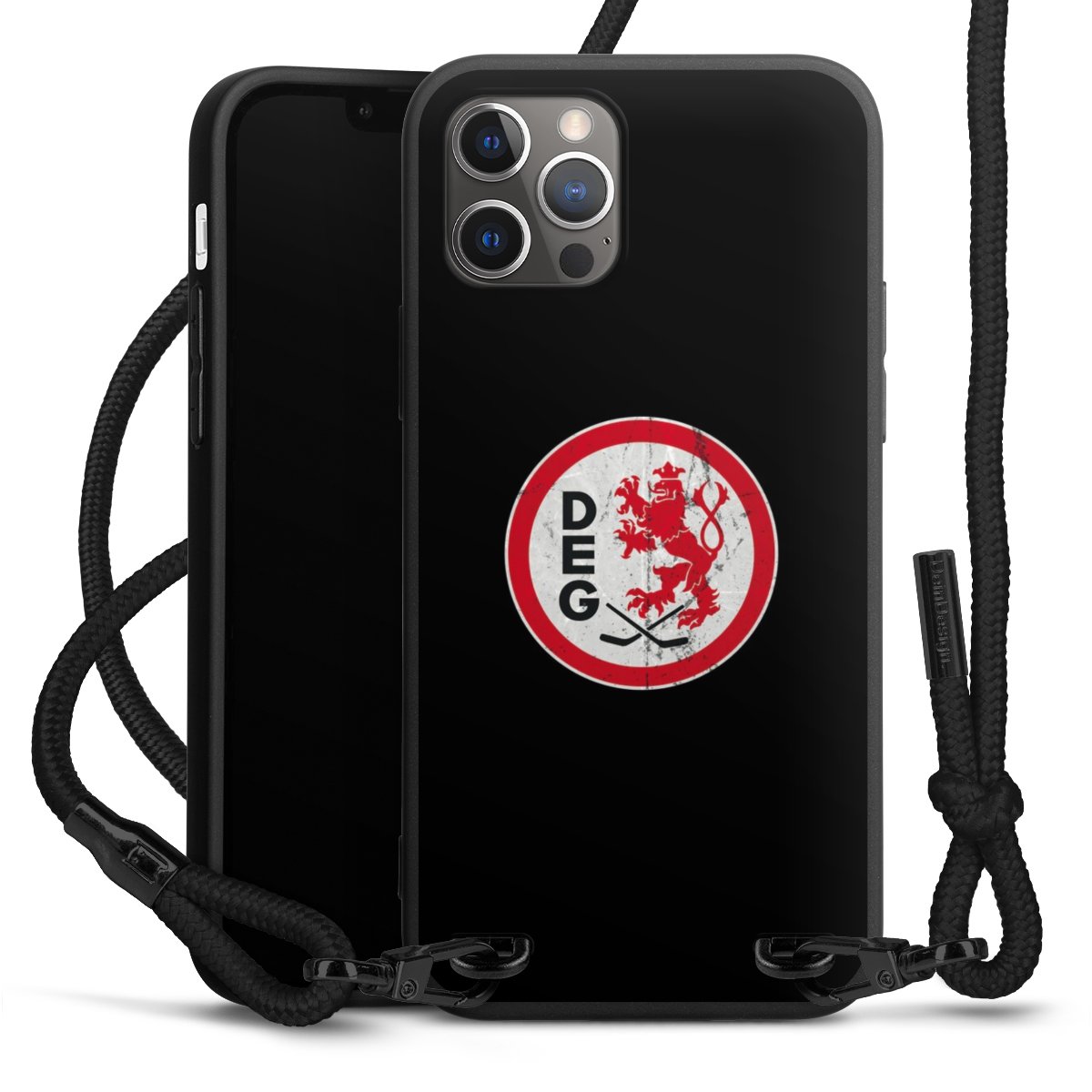 Pure Black: Handyhülle, Stoffband und Metalldetails in stylischem Mattschwarz.