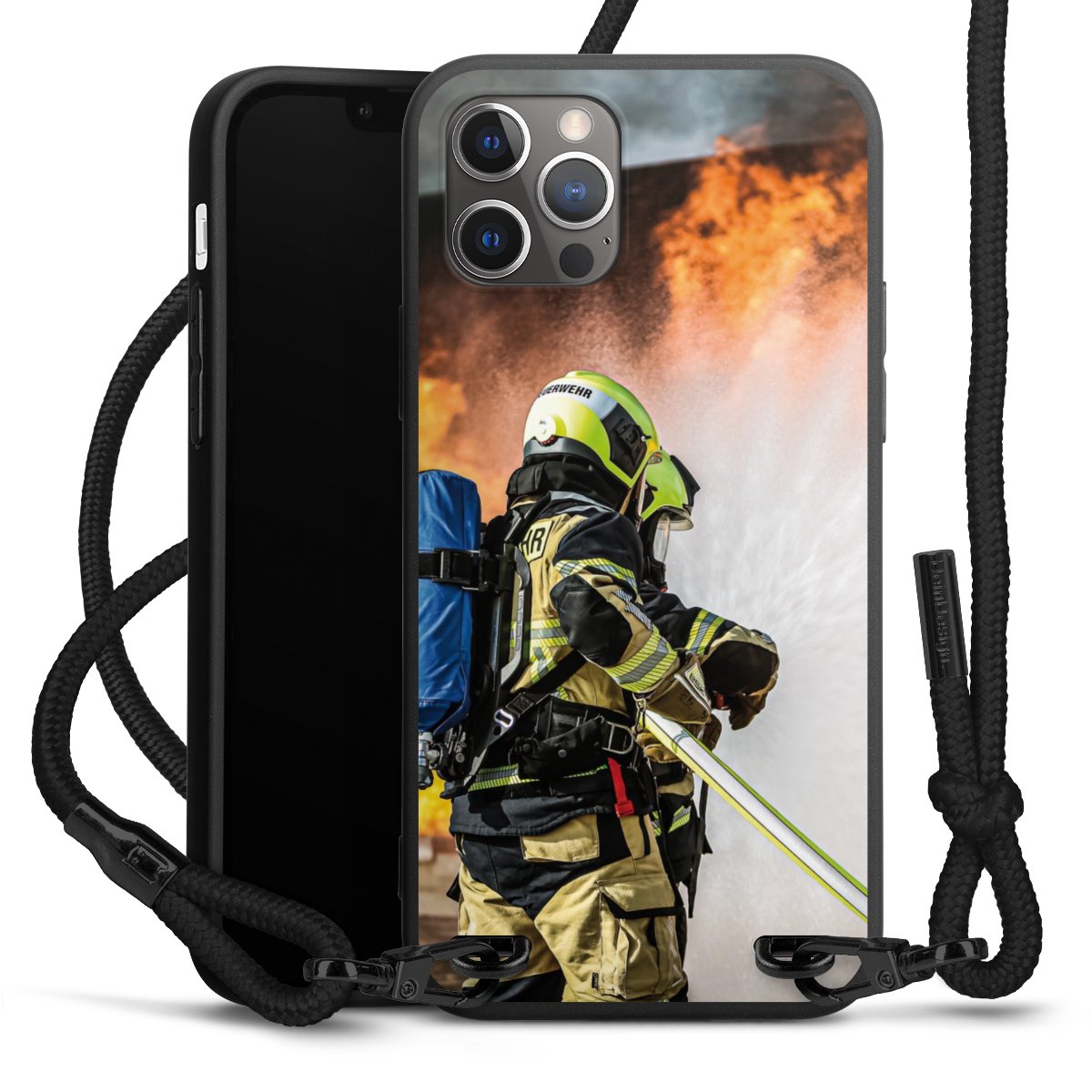 Pure Black: Handyhülle, Stoffband und Metalldetails in stylischem Mattschwarz.