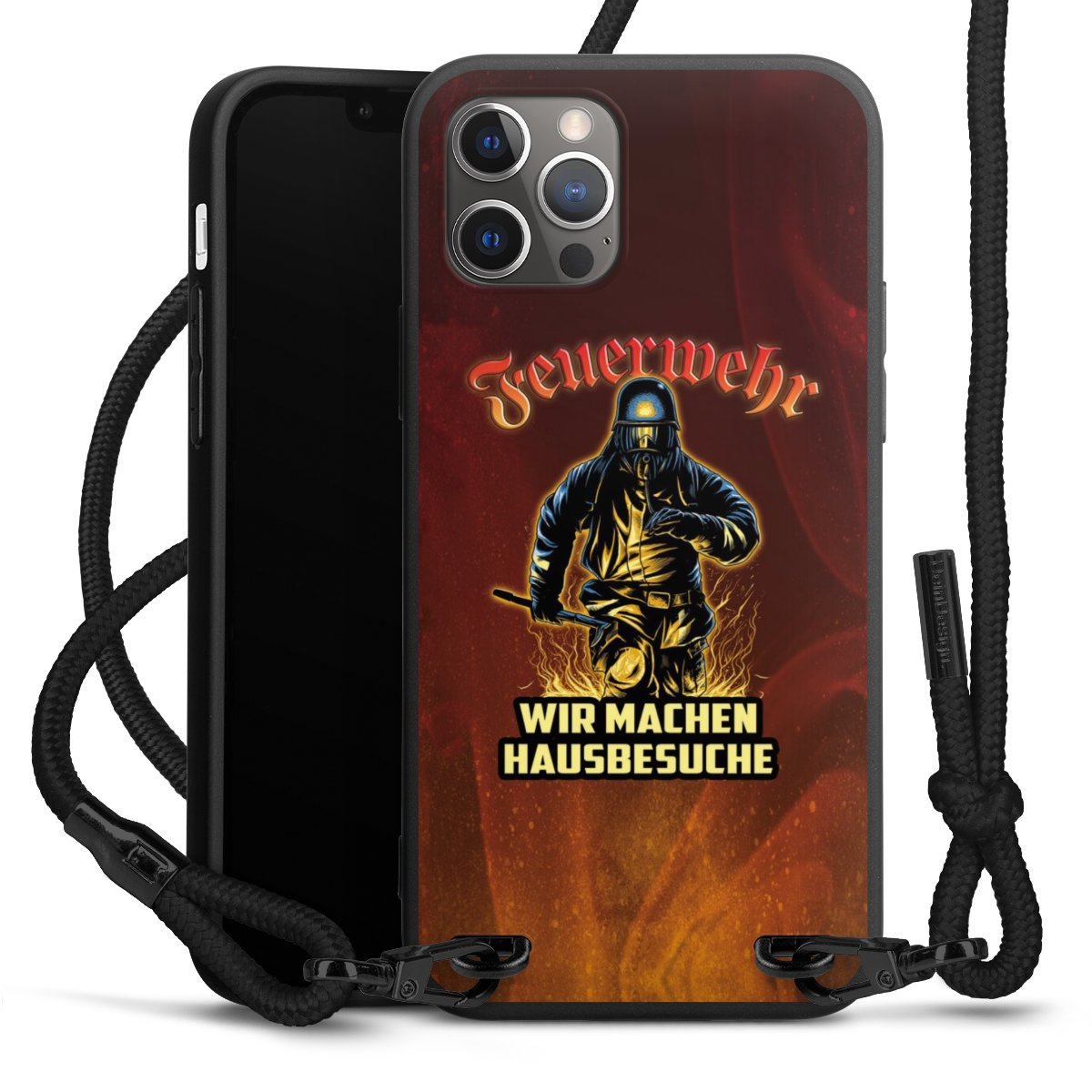 Pure Black: Handyhülle, Stoffband und Metalldetails in stylischem Mattschwarz.