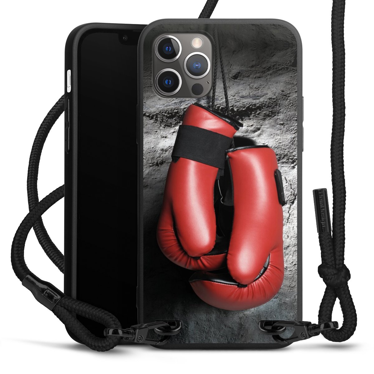 Pure Black: Handyhülle, Stoffband und Metalldetails in stylischem Mattschwarz.