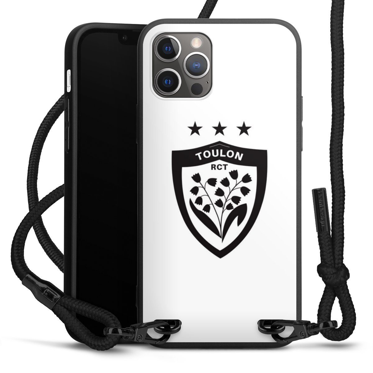 Pure Black: Handyhülle, Stoffband und Metalldetails in stylischem Mattschwarz.
