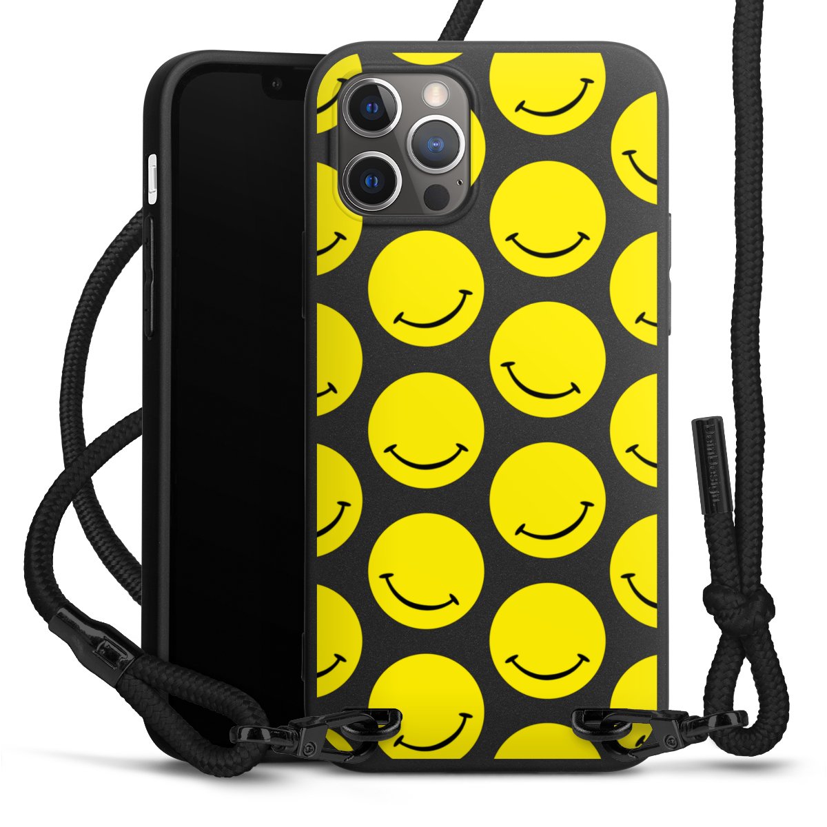 Pure Black: Handyhülle, Stoffband und Metalldetails in stylischem Mattschwarz.