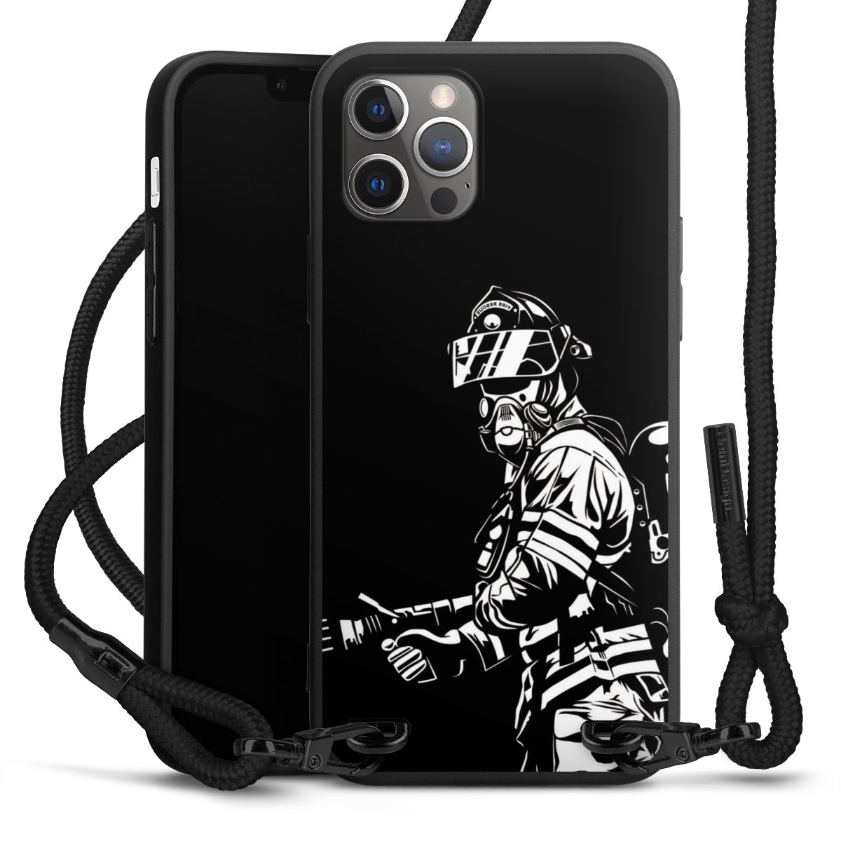 Pure Black: Handyhülle, Stoffband und Metalldetails in stylischem Mattschwarz.