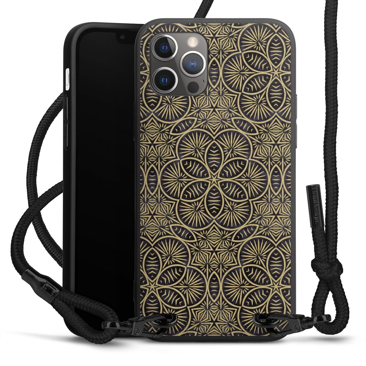 Pure Black: Handyhülle, Stoffband und Metalldetails in stylischem Mattschwarz.