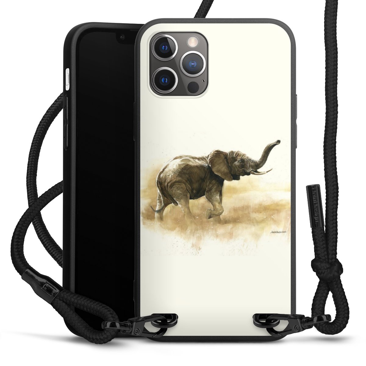 Pure Black: Handyhülle, Stoffband und Metalldetails in stylischem Mattschwarz.