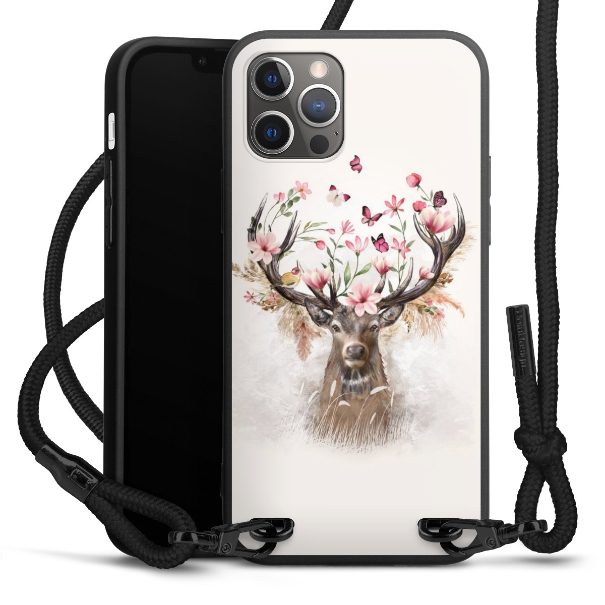 Pure Black: Handyhülle, Stoffband und Metalldetails in stylischem Mattschwarz.