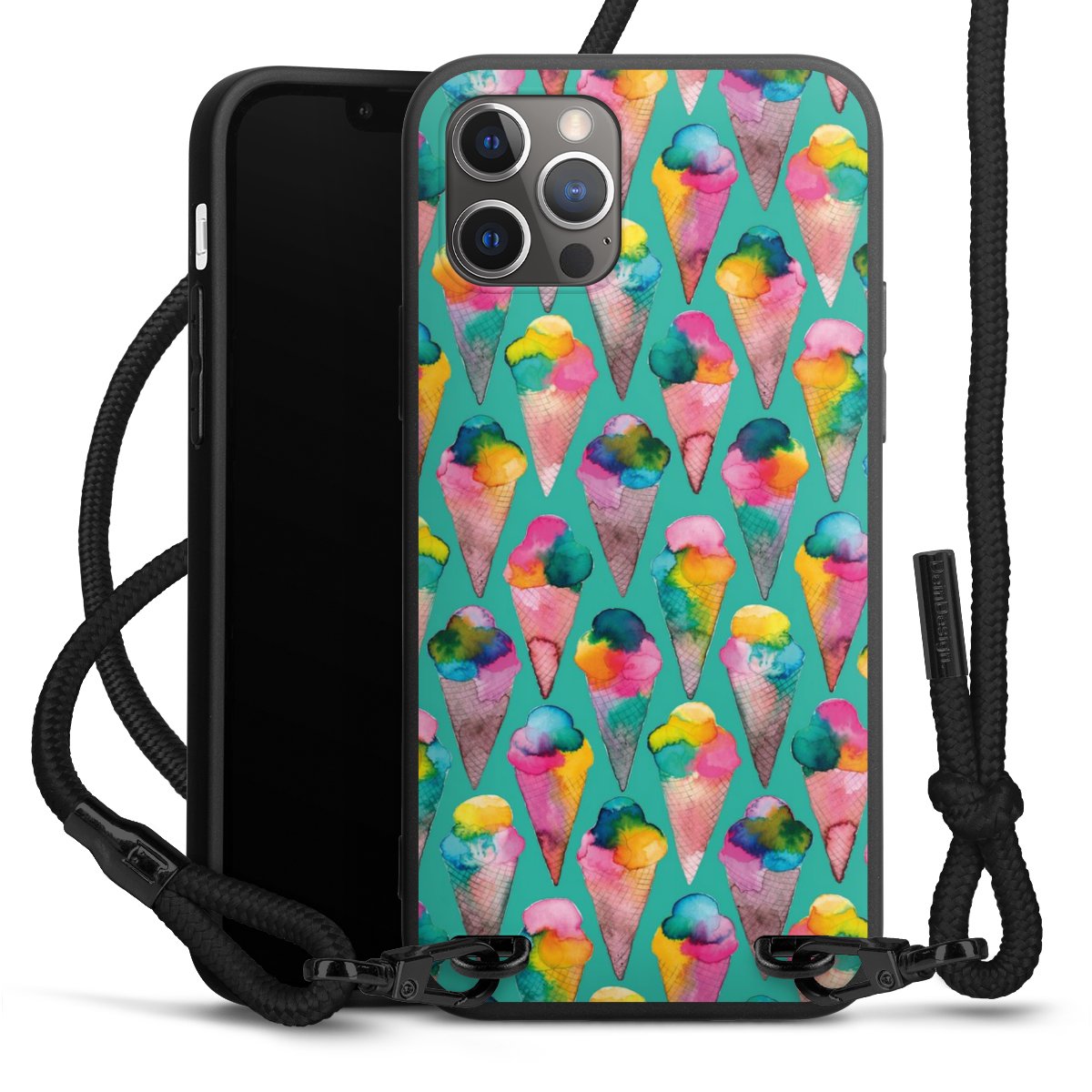 Pure Black: Handyhülle, Stoffband und Metalldetails in stylischem Mattschwarz.