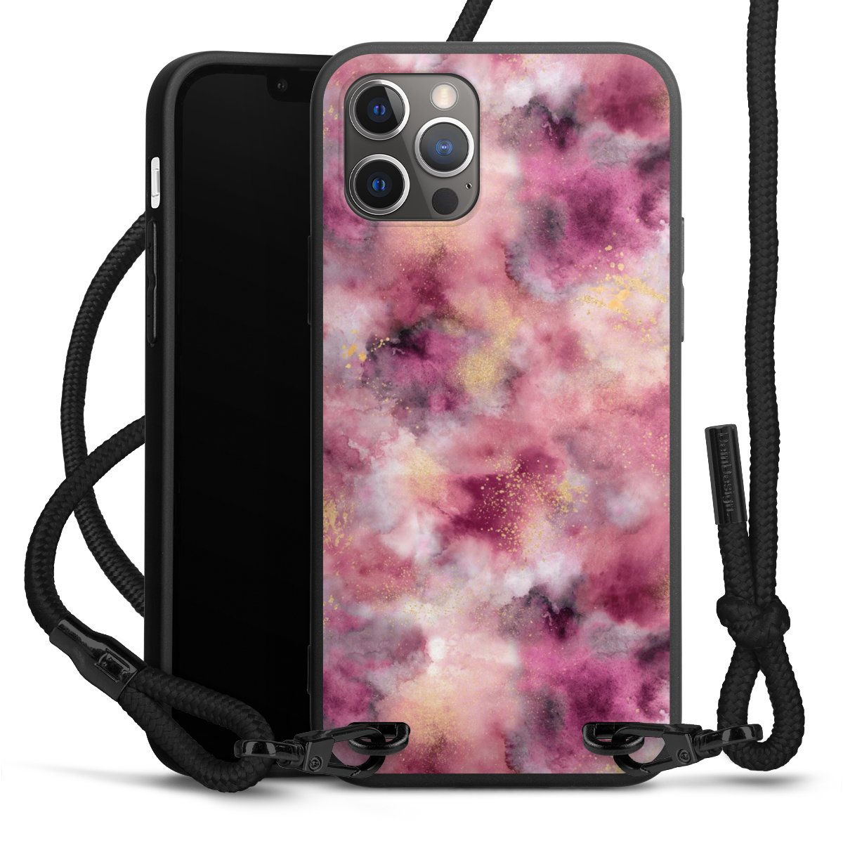 Pure Black: Handyhülle, Stoffband und Metalldetails in stylischem Mattschwarz.