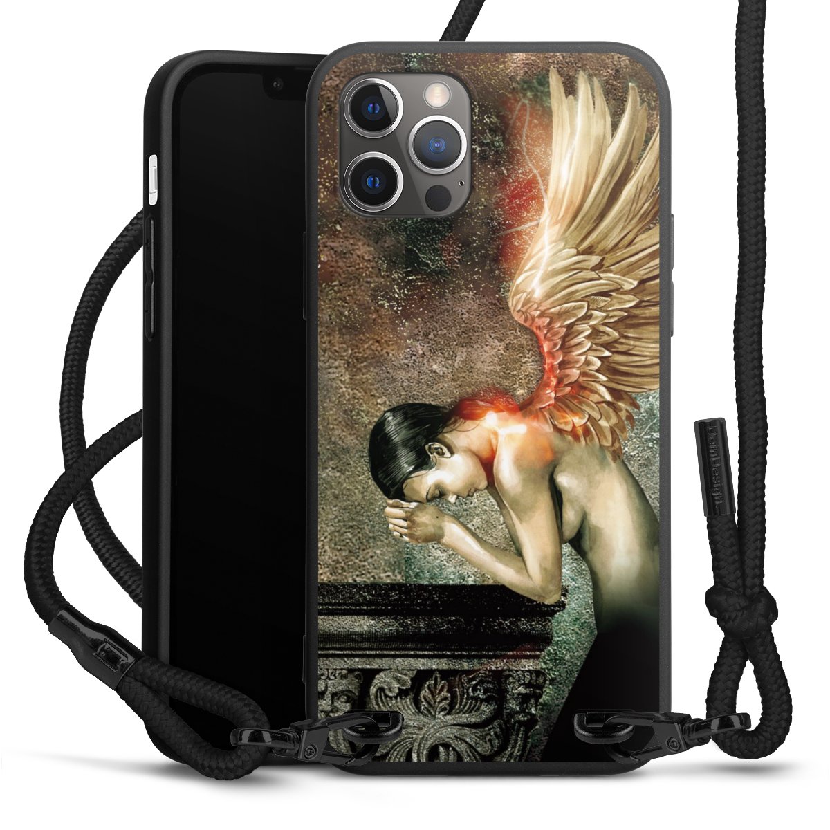 Pure Black: Handyhülle, Stoffband und Metalldetails in stylischem Mattschwarz.