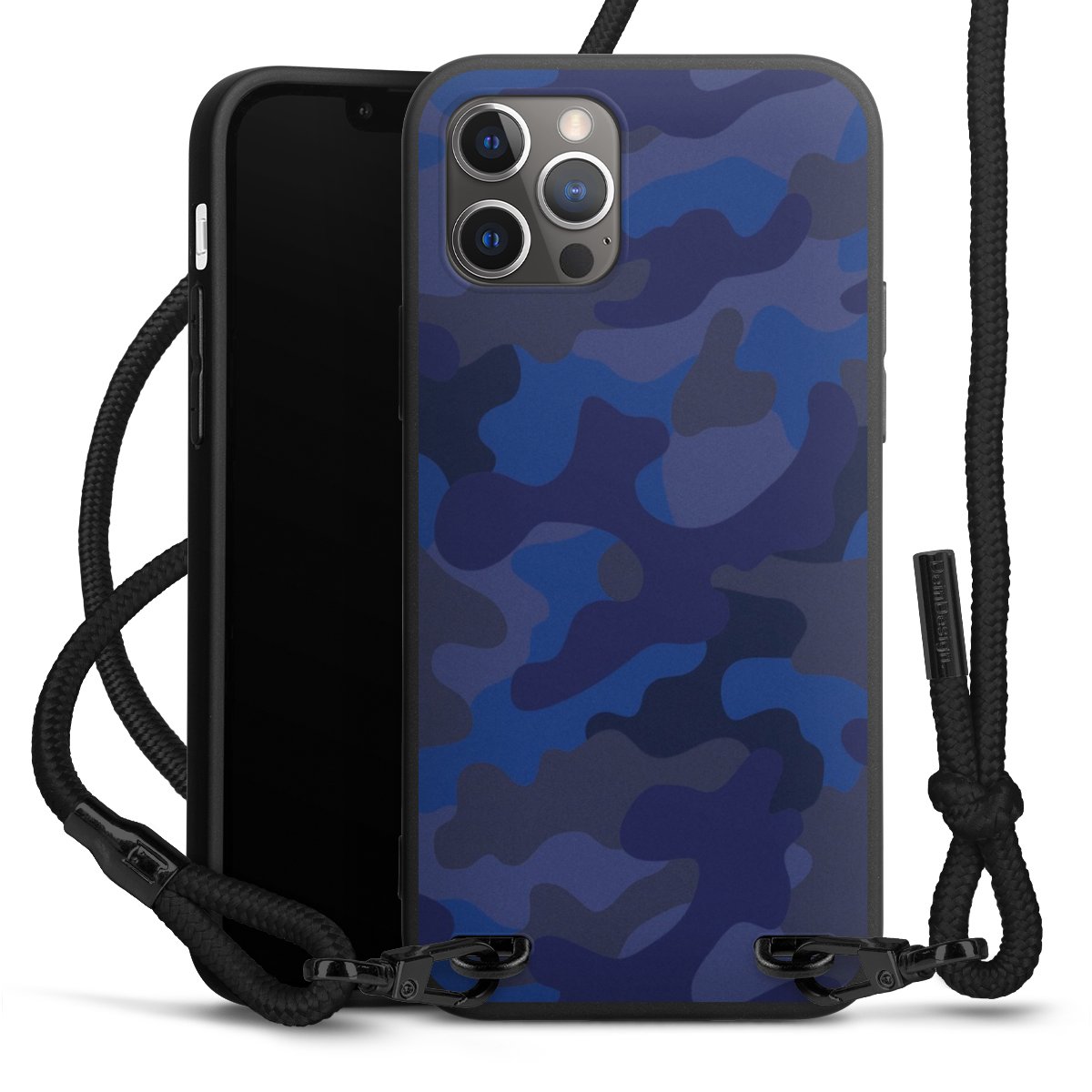 Pure Black: Handyhülle, Stoffband und Metalldetails in stylischem Mattschwarz.