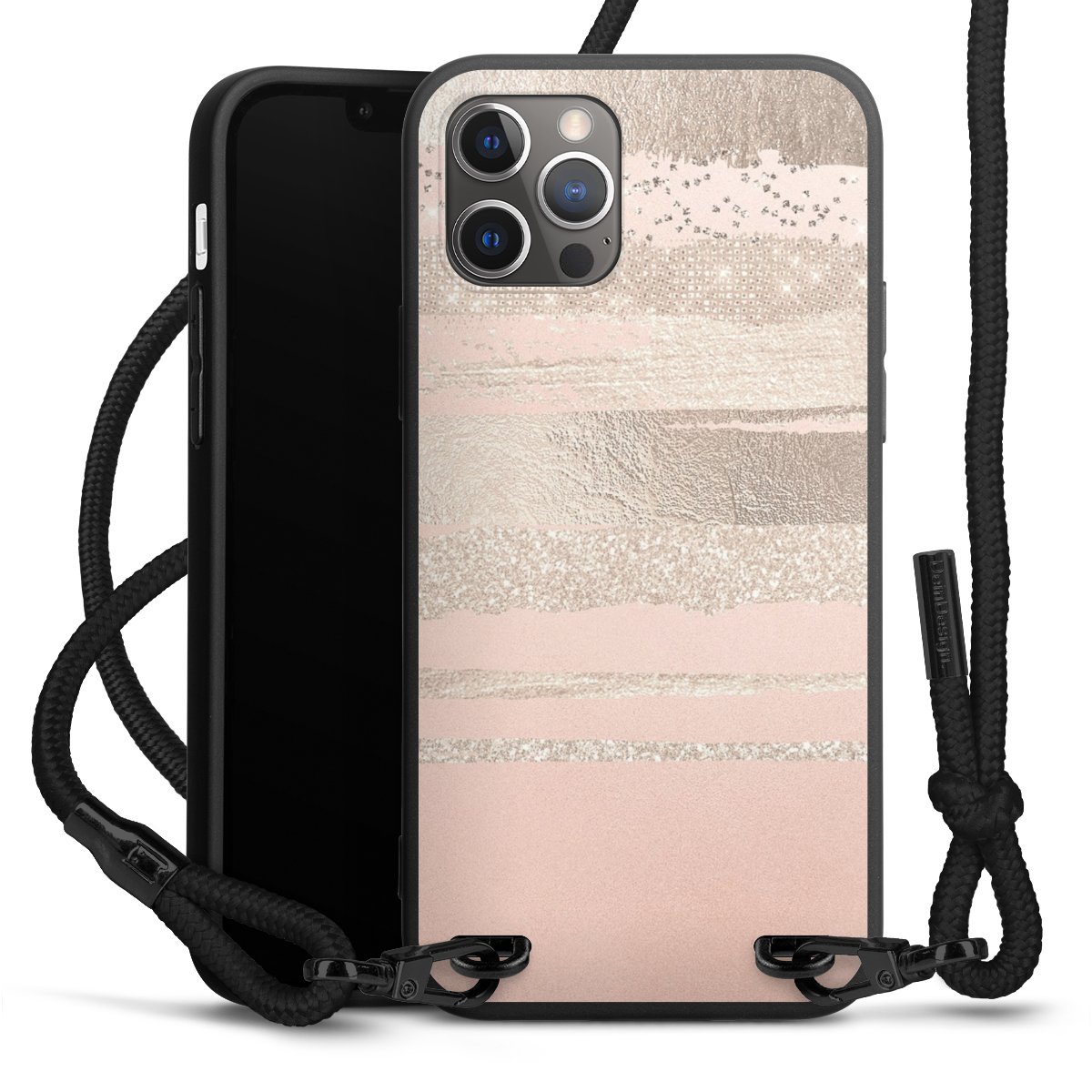 Pure Black: Handyhülle, Stoffband und Metalldetails in stylischem Mattschwarz.