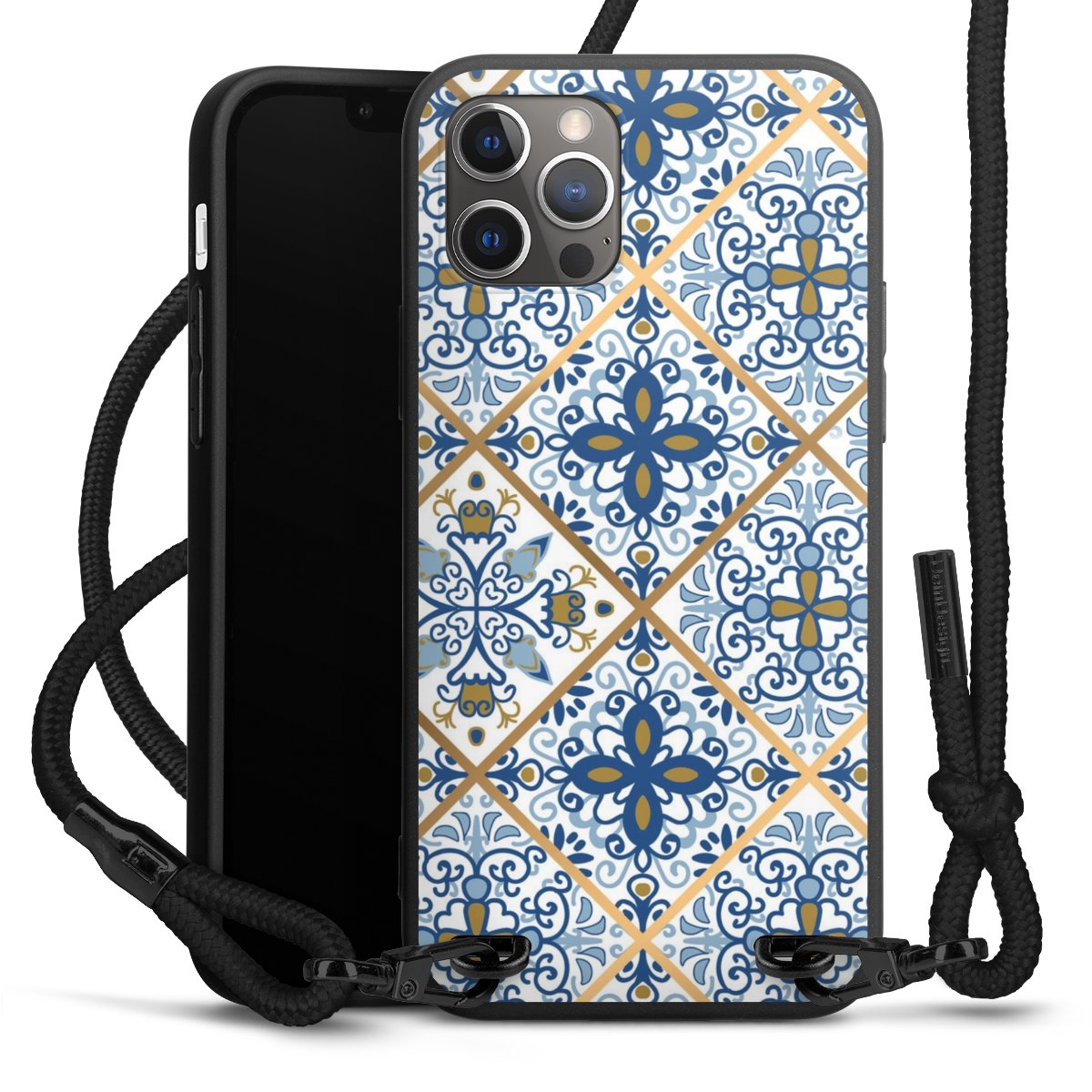 Pure Black: Handyhülle, Stoffband und Metalldetails in stylischem Mattschwarz.