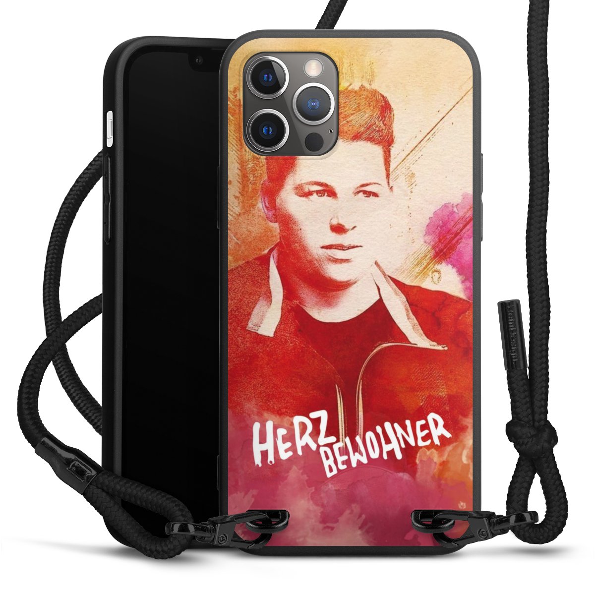 Pure Black: Handyhülle, Stoffband und Metalldetails in stylischem Mattschwarz.
