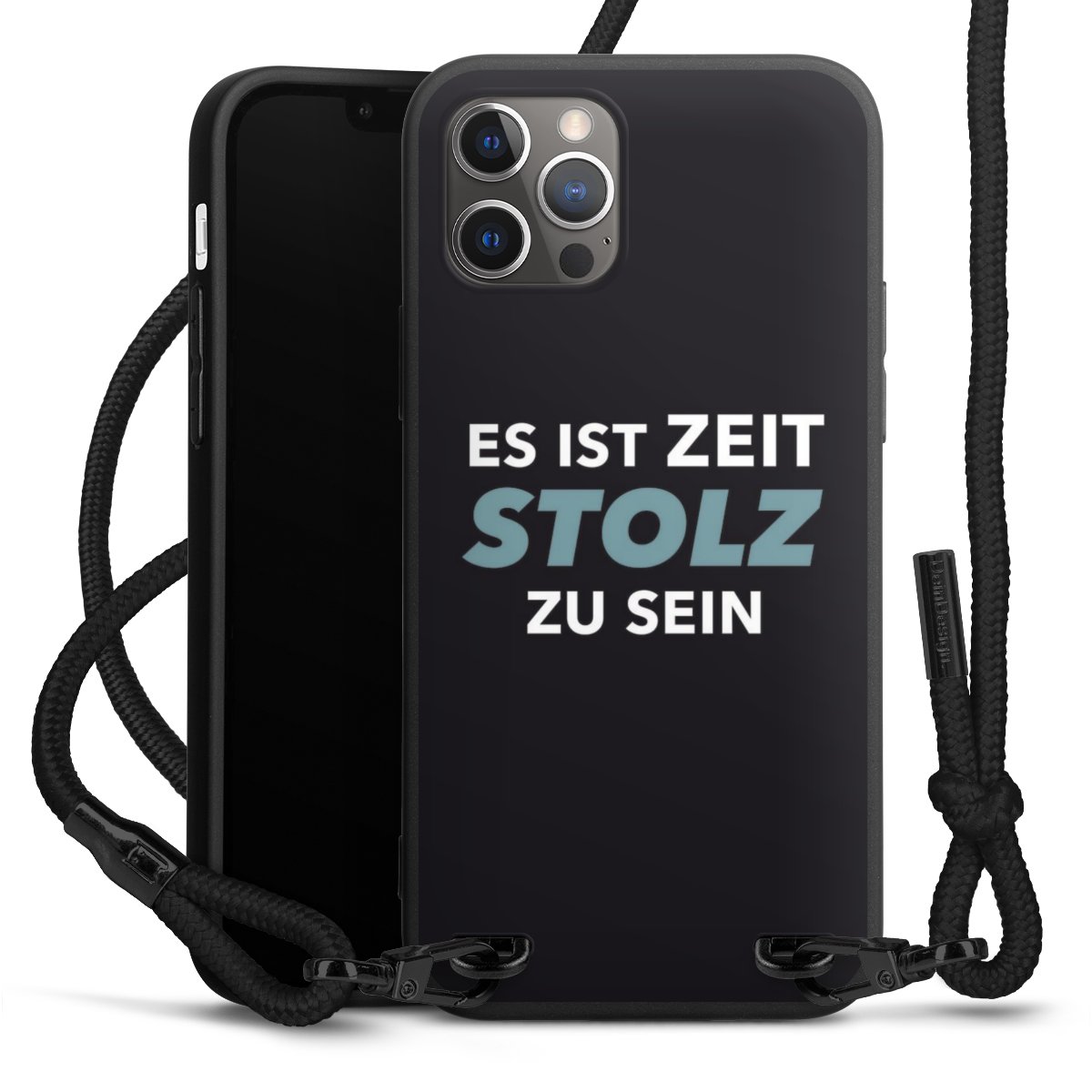 Pure Black: Handyhülle, Stoffband und Metalldetails in stylischem Mattschwarz.