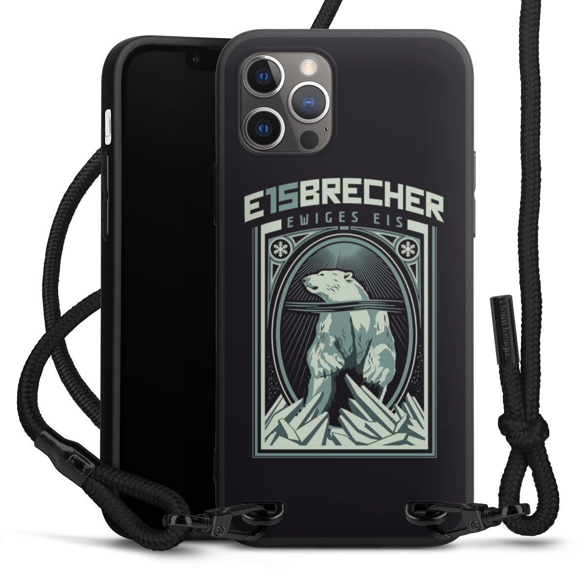 Pure Black: Handyhülle, Stoffband und Metalldetails in stylischem Mattschwarz.