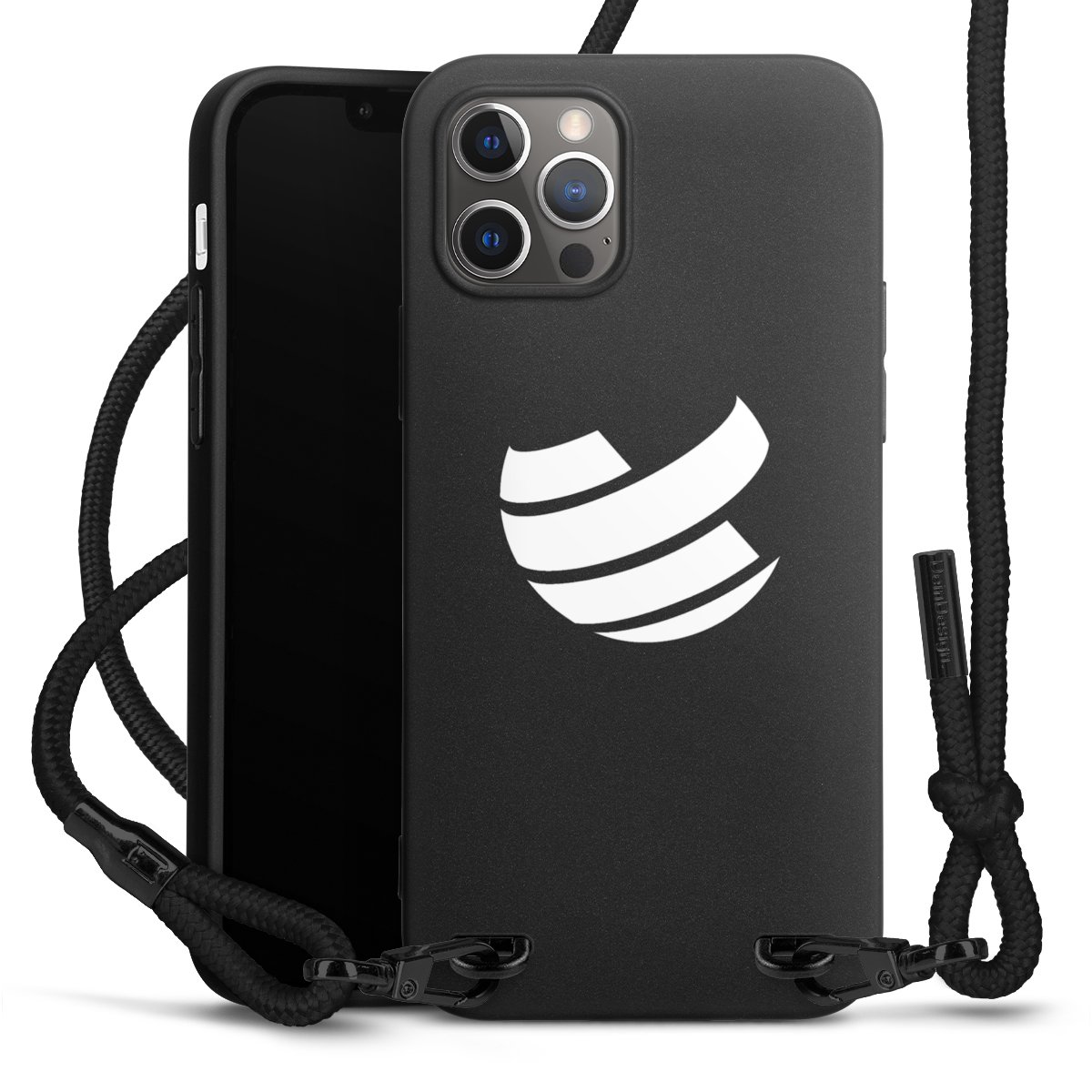 Pure Black: Handyhülle, Stoffband und Metalldetails in stylischem Mattschwarz.