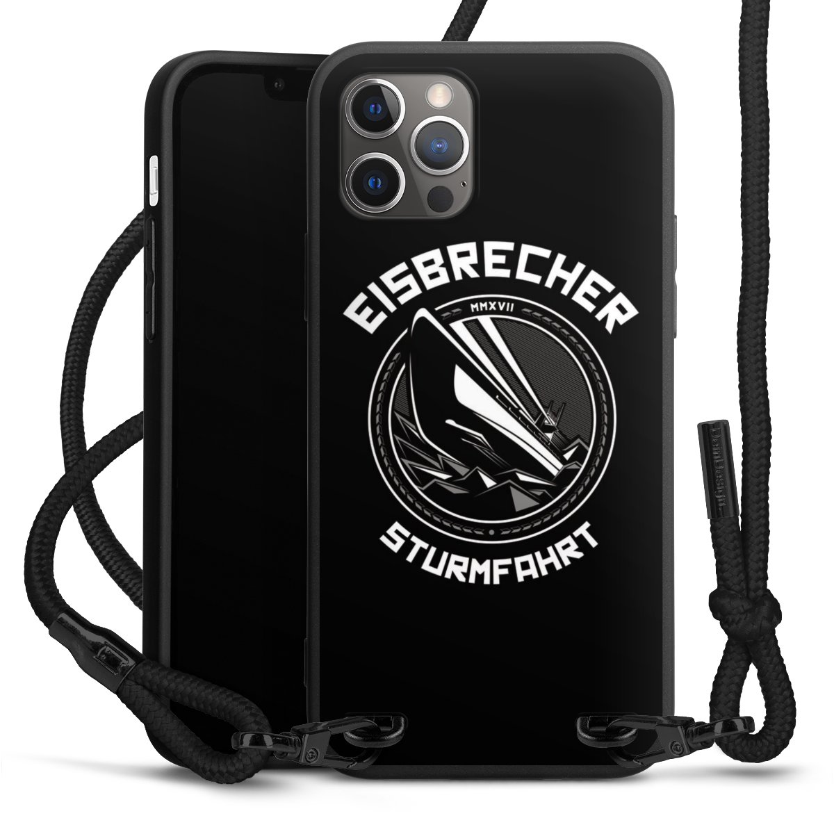 Pure Black: Handyhülle, Stoffband und Metalldetails in stylischem Mattschwarz.