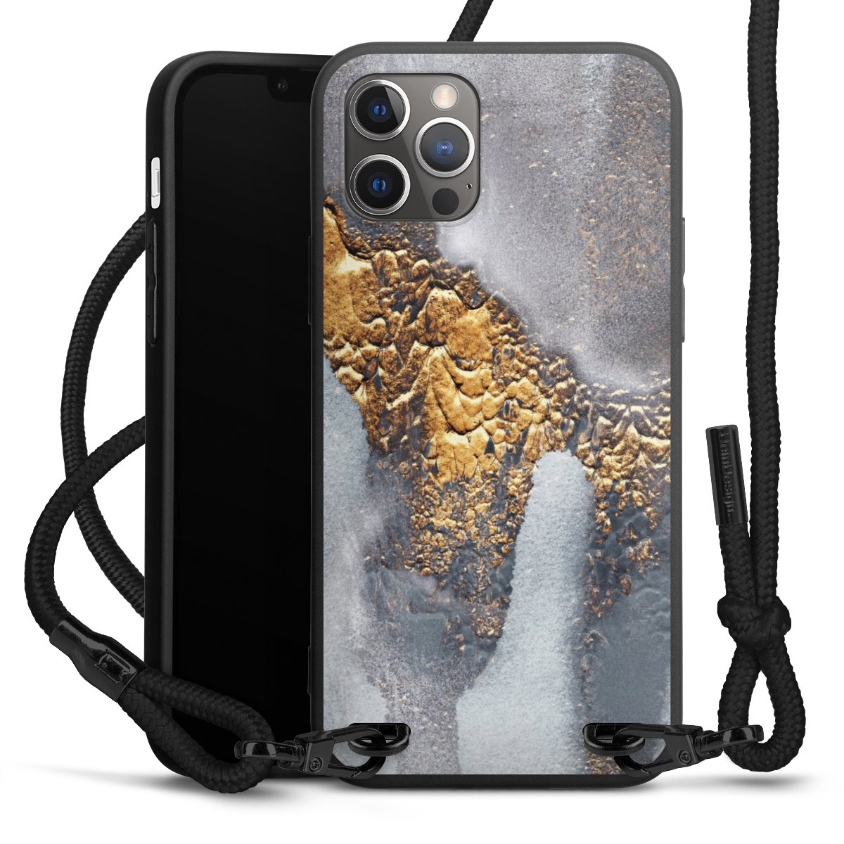 Pure Black: Handyhülle, Stoffband und Metalldetails in stylischem Mattschwarz.