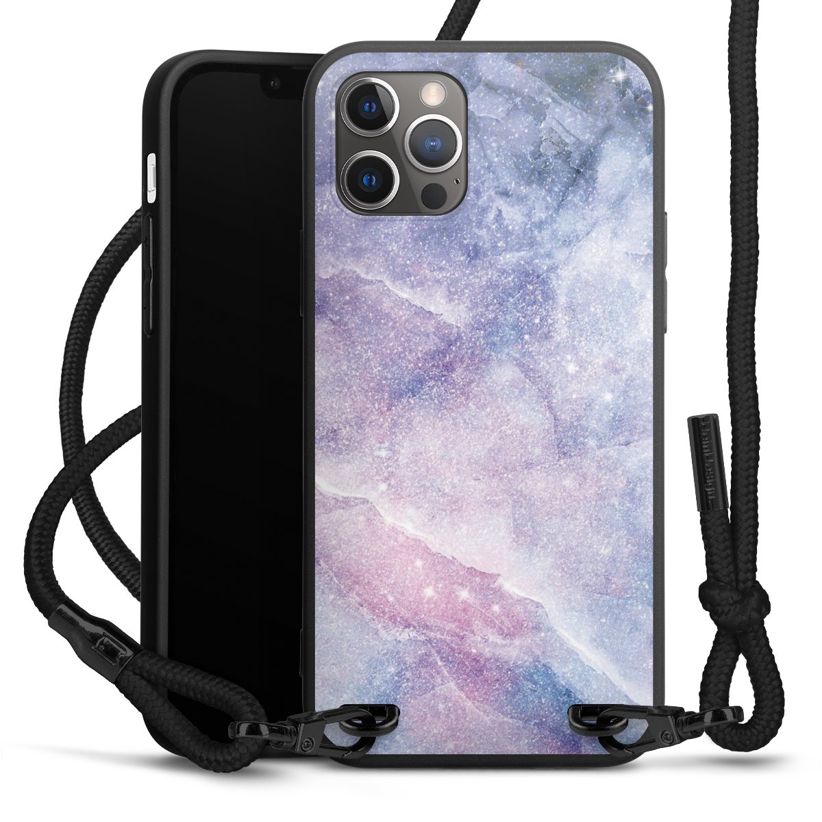 Pure Black: Handyhülle, Stoffband und Metalldetails in stylischem Mattschwarz.
