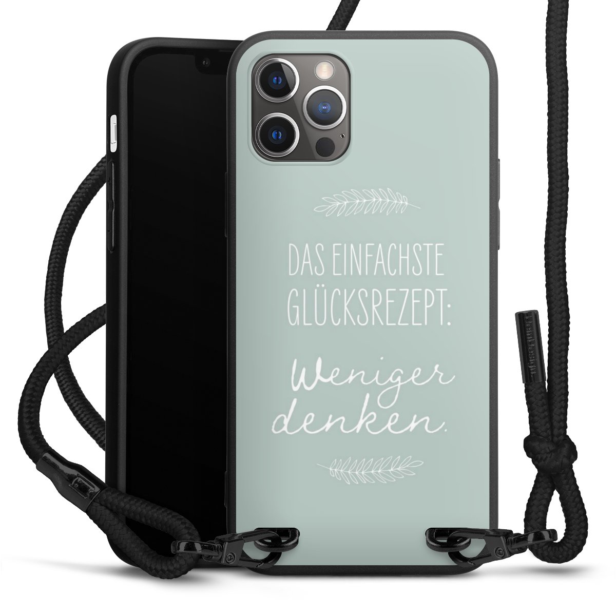 Pure Black: Handyhülle, Stoffband und Metalldetails in stylischem Mattschwarz.