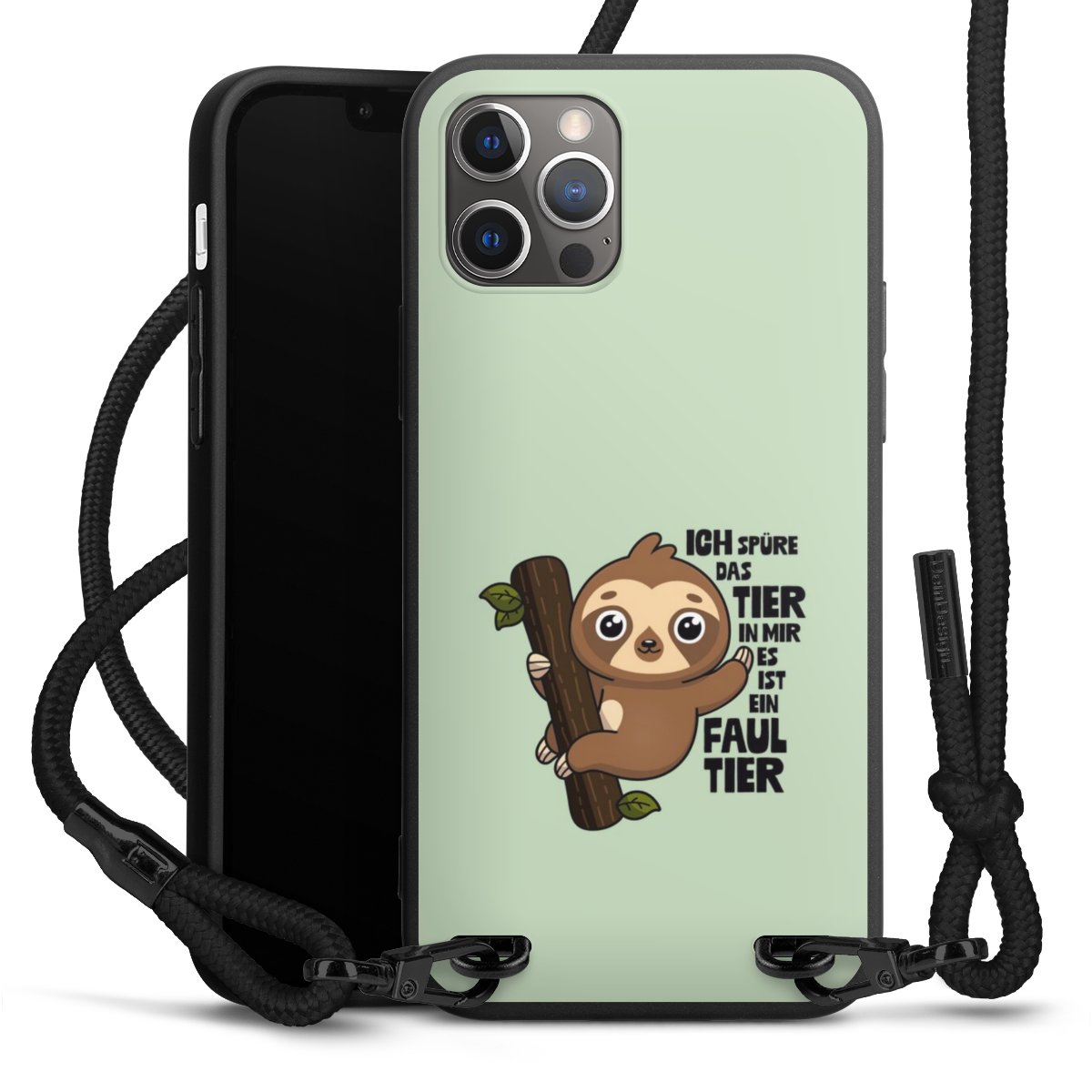 Pure Black: Handyhülle, Stoffband und Metalldetails in stylischem Mattschwarz.