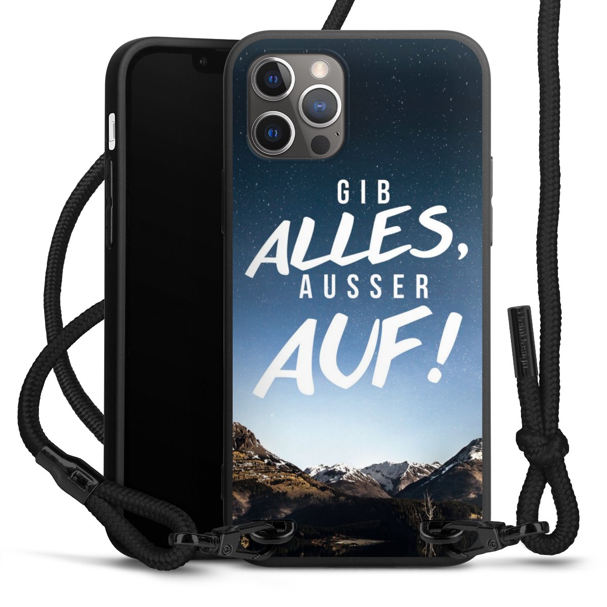 Pure Black: Handyhülle, Stoffband und Metalldetails in stylischem Mattschwarz.