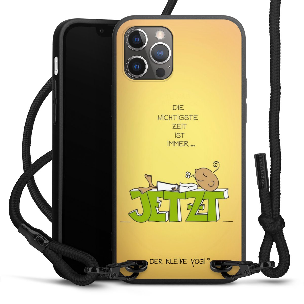 Pure Black: Handyhülle, Stoffband und Metalldetails in stylischem Mattschwarz.