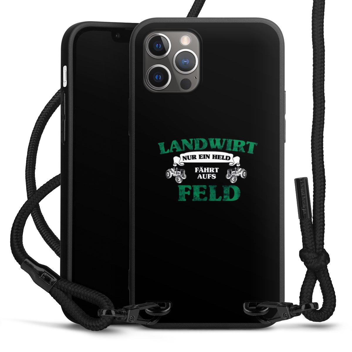 Pure Black: Handyhülle, Stoffband und Metalldetails in stylischem Mattschwarz.
