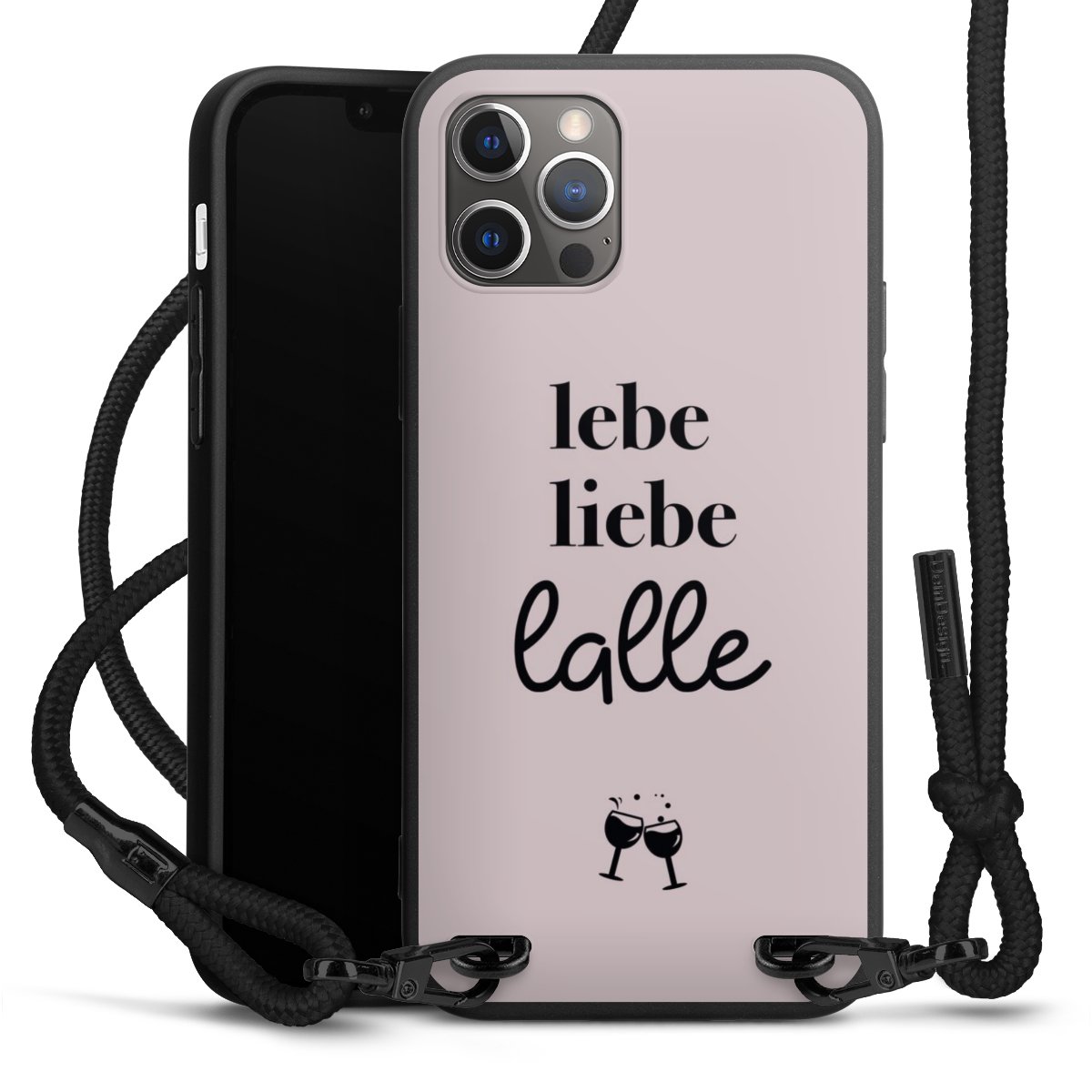 Pure Black: Handyhülle, Stoffband und Metalldetails in stylischem Mattschwarz.