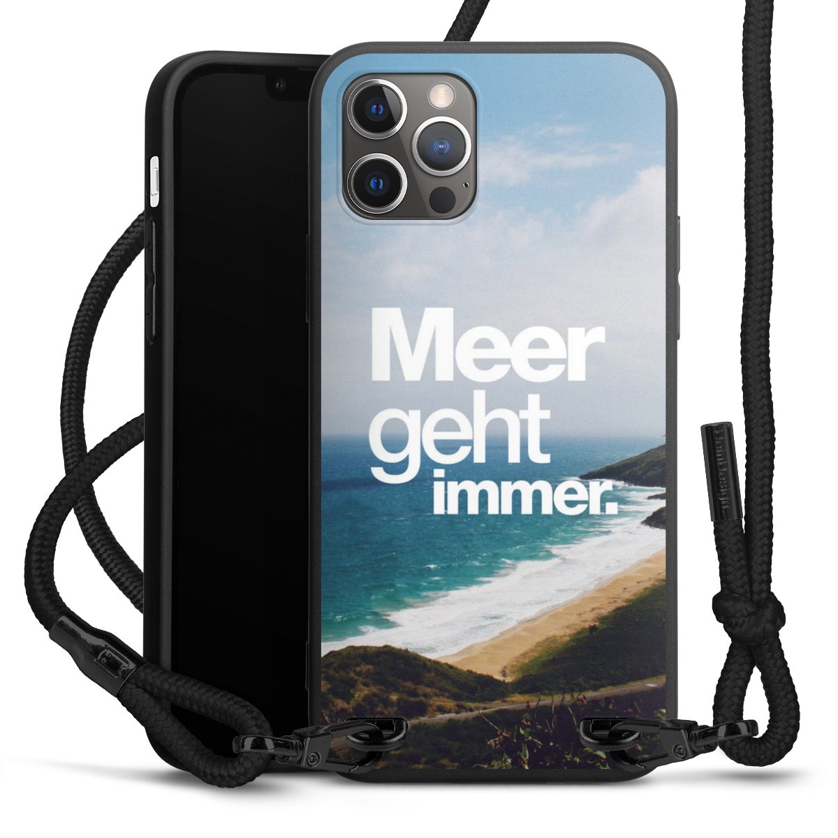 Pure Black: Handyhülle, Stoffband und Metalldetails in stylischem Mattschwarz.