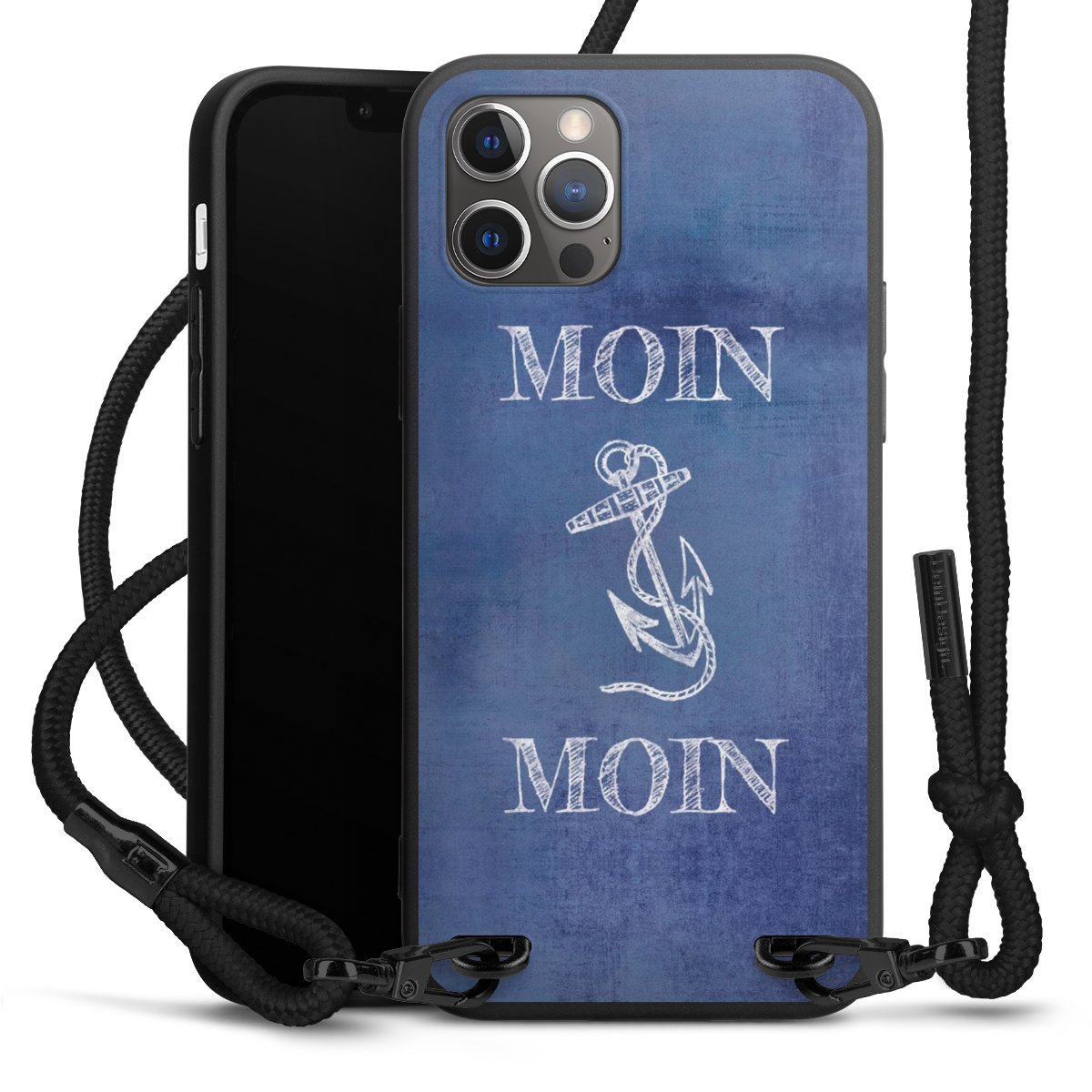Pure Black: Handyhülle, Stoffband und Metalldetails in stylischem Mattschwarz.