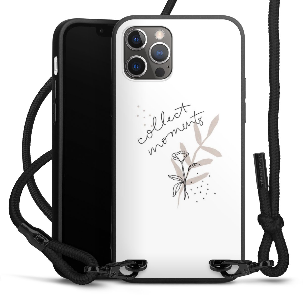 Pure Black: Handyhülle, Stoffband und Metalldetails in stylischem Mattschwarz.