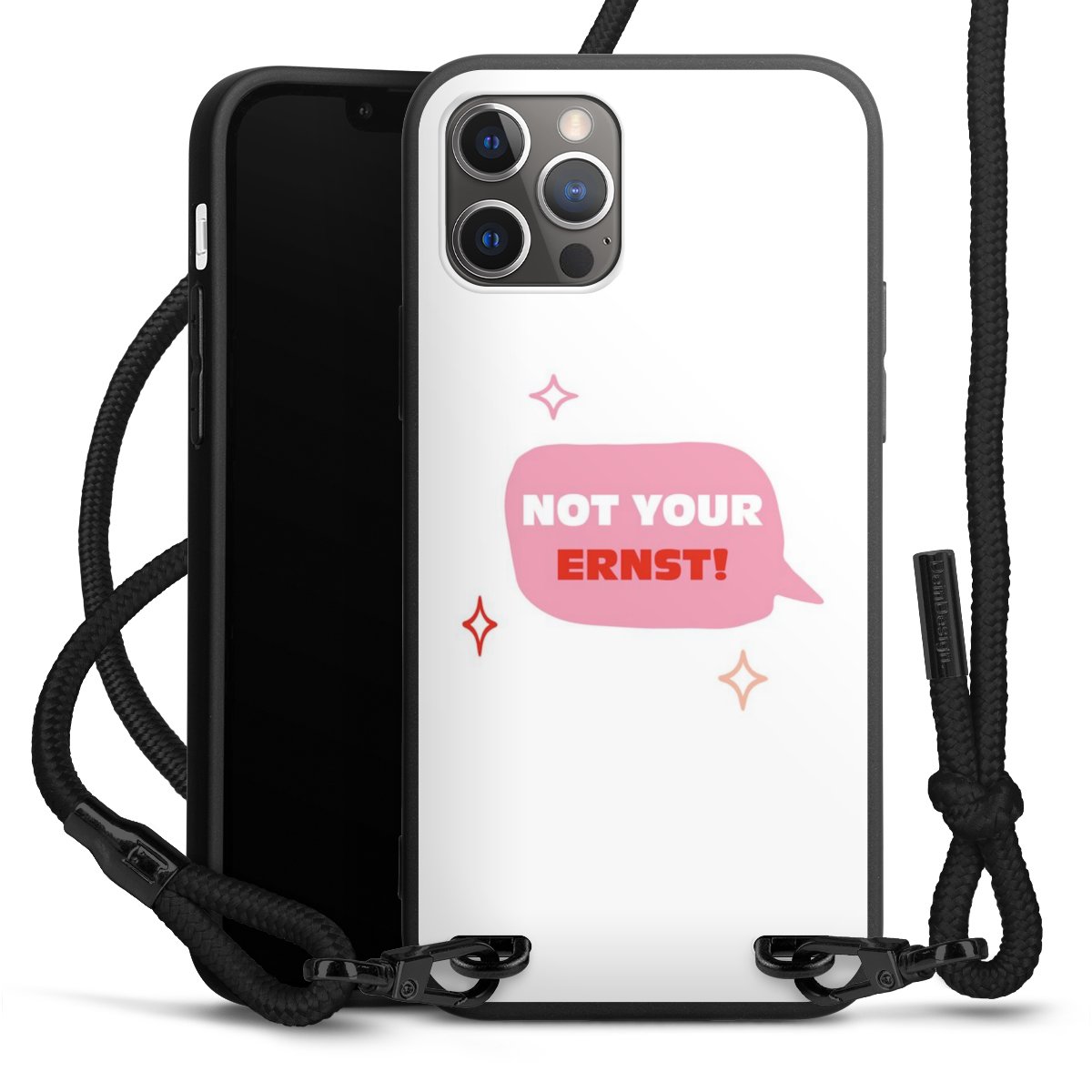 Pure Black: Handyhülle, Stoffband und Metalldetails in stylischem Mattschwarz.