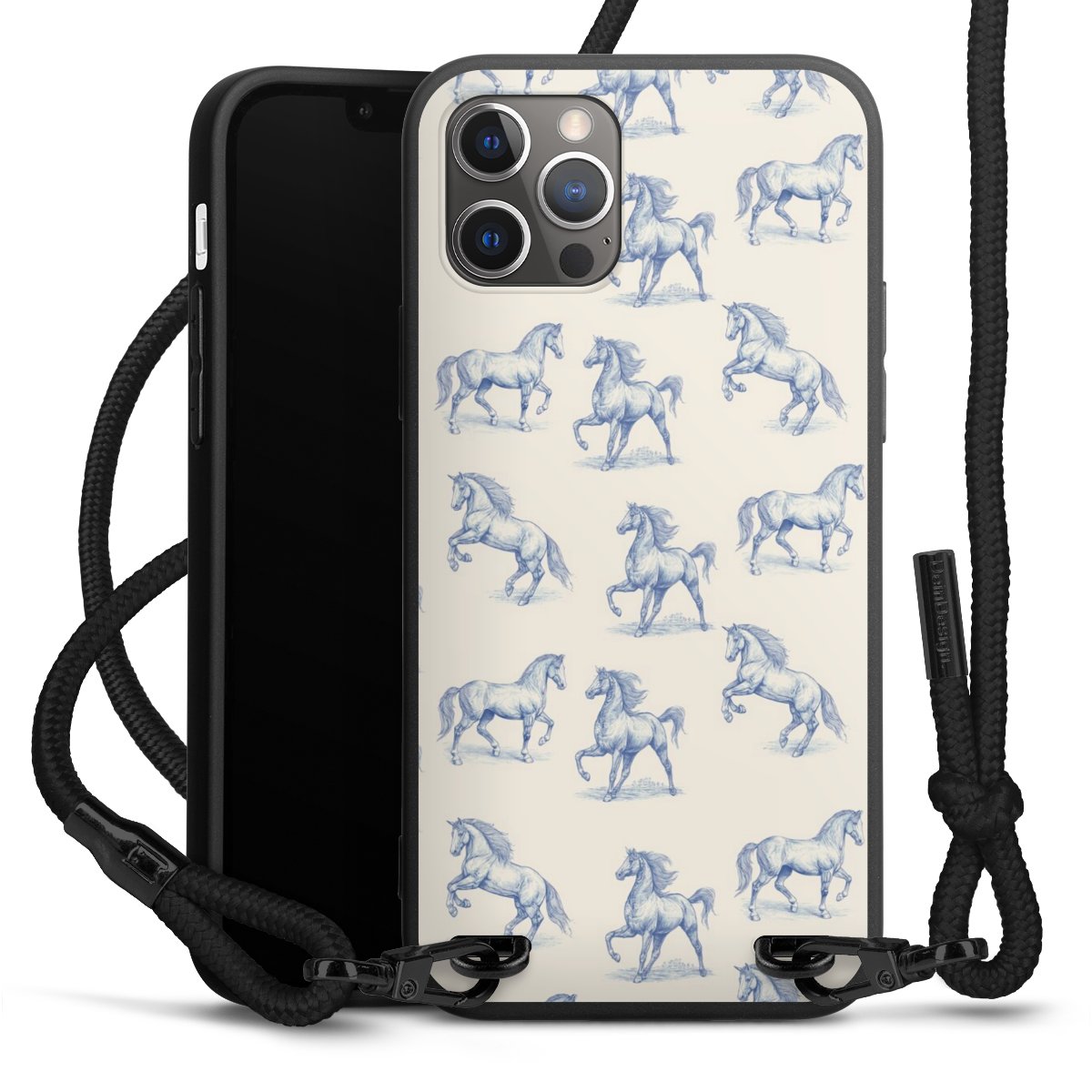 Pure Black: Handyhülle, Stoffband und Metalldetails in stylischem Mattschwarz.