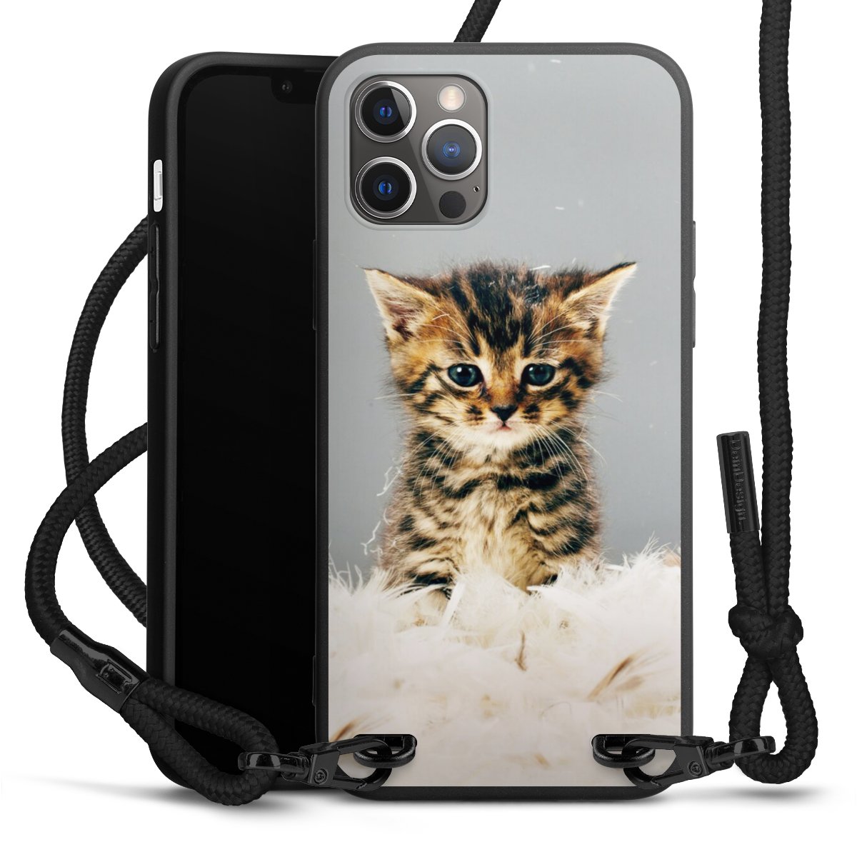 Pure Black: Handyhülle, Stoffband und Metalldetails in stylischem Mattschwarz.