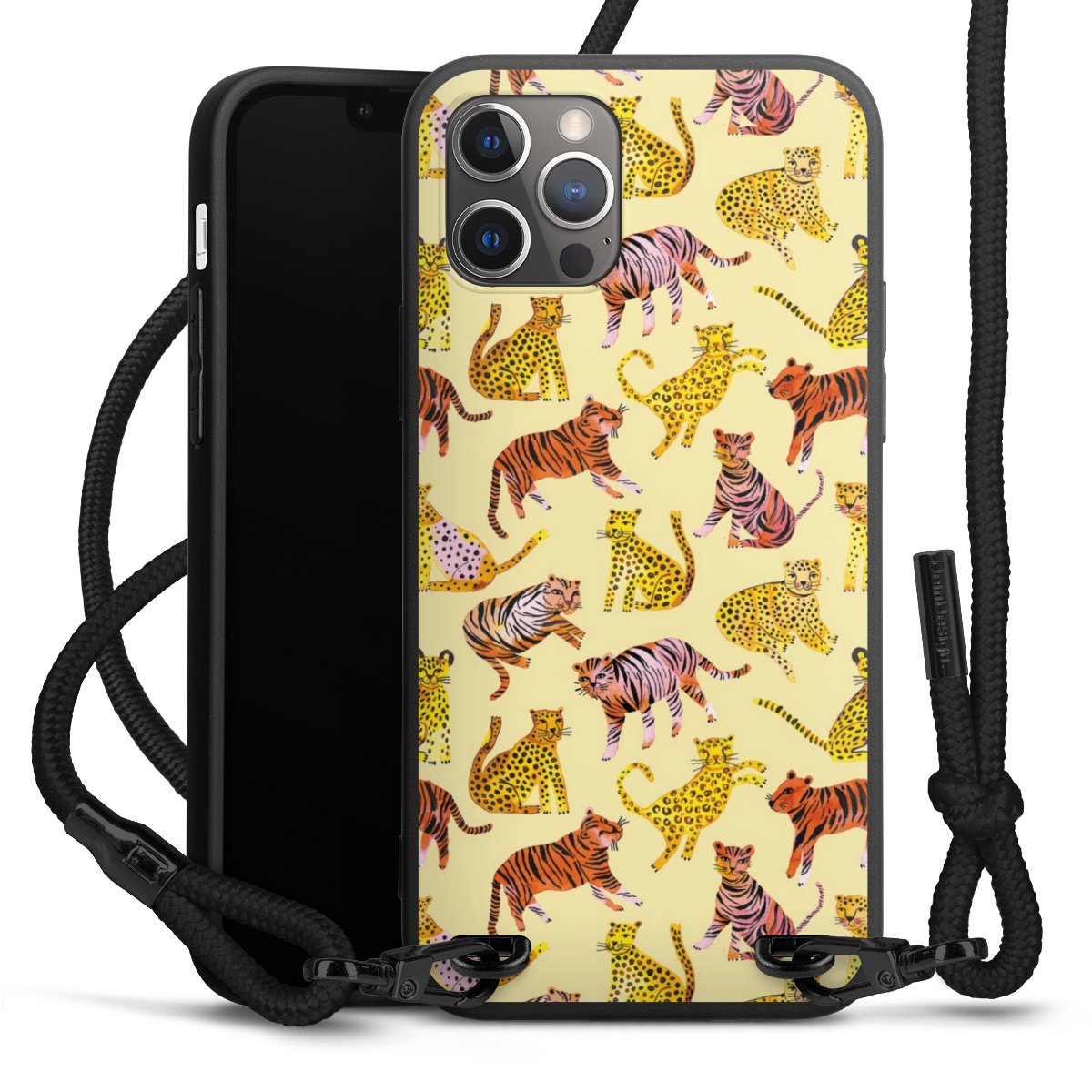 Pure Black: Handyhülle, Stoffband und Metalldetails in stylischem Mattschwarz.