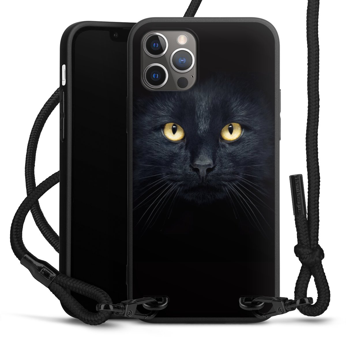 Pure Black: Handyhülle, Stoffband und Metalldetails in stylischem Mattschwarz.