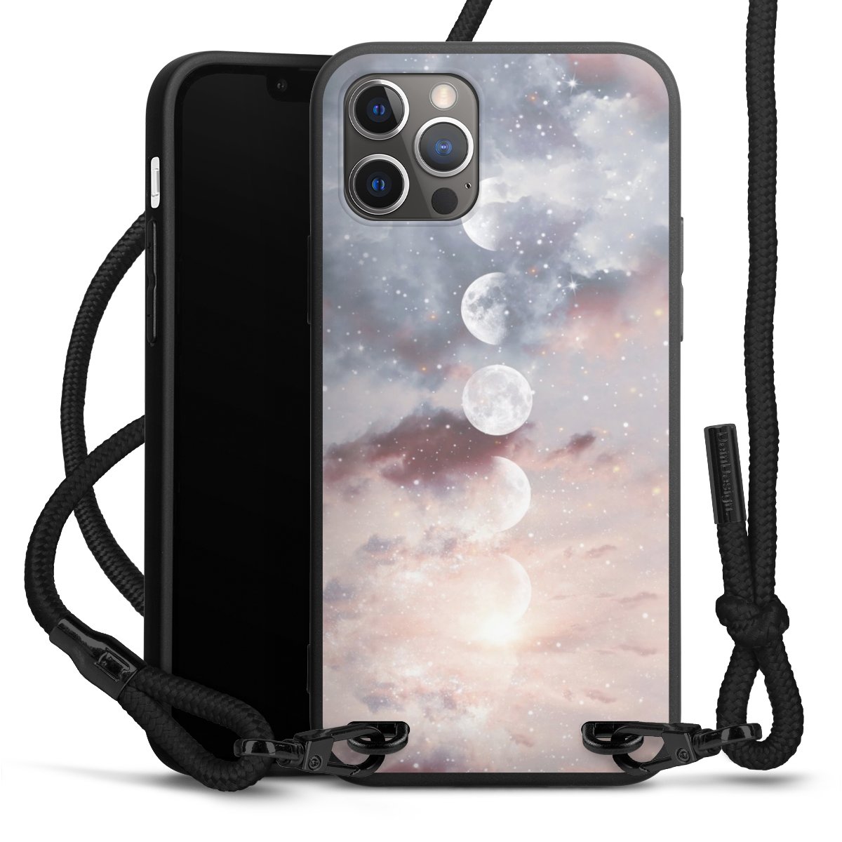 Pure Black: Handyhülle, Stoffband und Metalldetails in stylischem Mattschwarz.