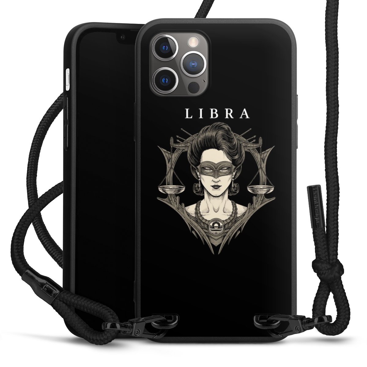 Pure Black: Handyhülle, Stoffband und Metalldetails in stylischem Mattschwarz.