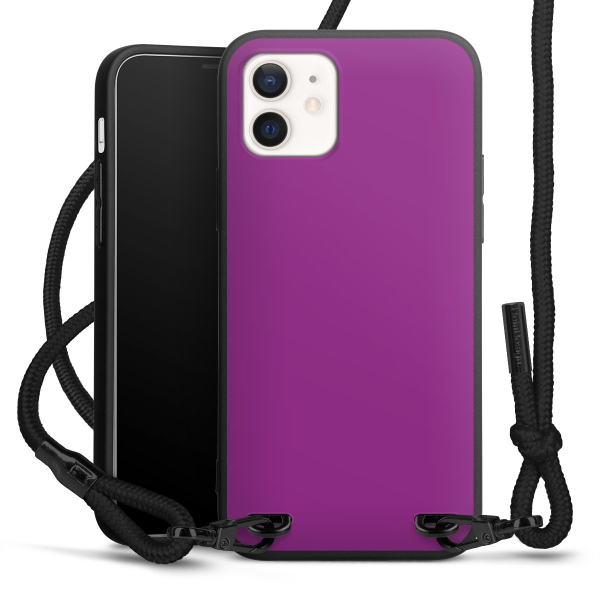 Pure Black: Handyhülle, Stoffband und Metalldetails in stylischem Mattschwarz.