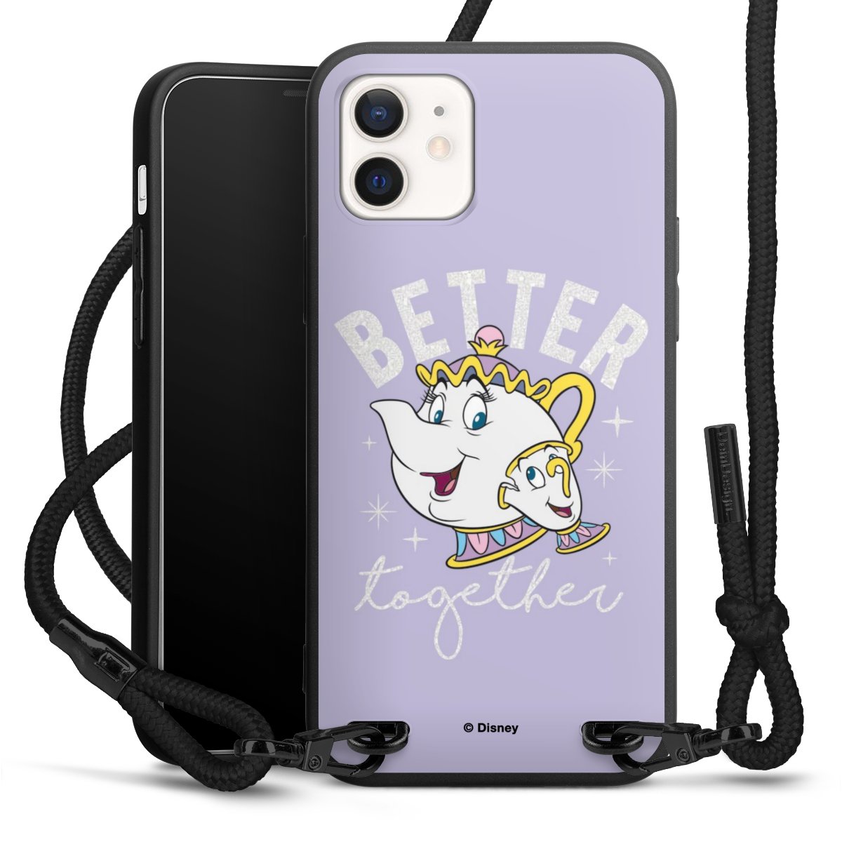 Pure Black: Handyhülle, Stoffband und Metalldetails in stylischem Mattschwarz.
