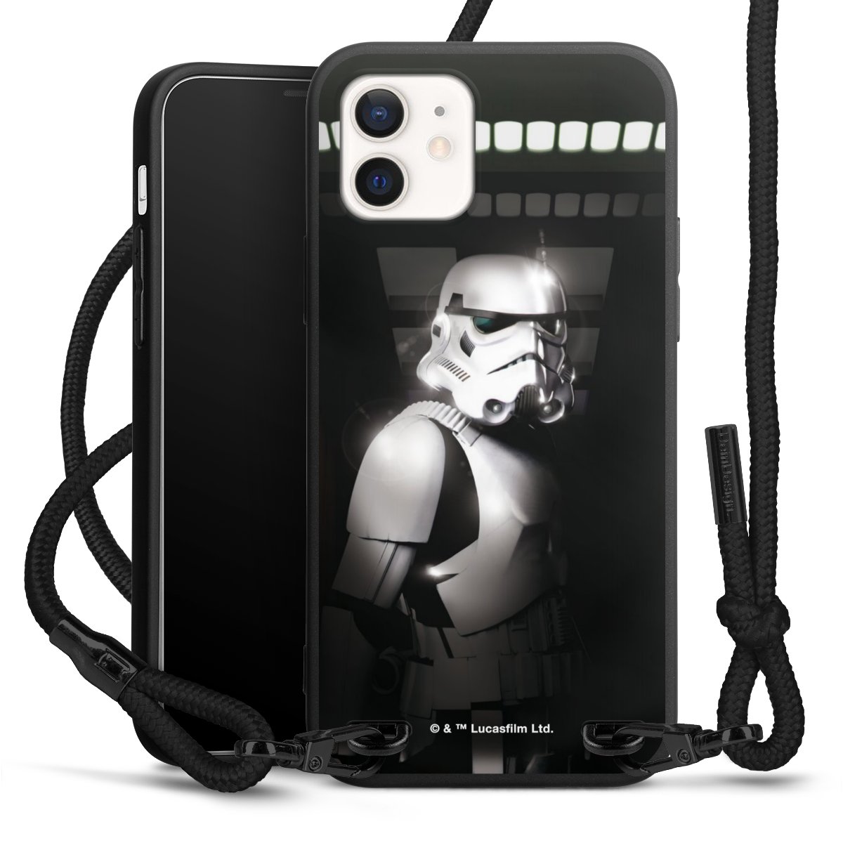 Pure Black: Handyhülle, Stoffband und Metalldetails in stylischem Mattschwarz.