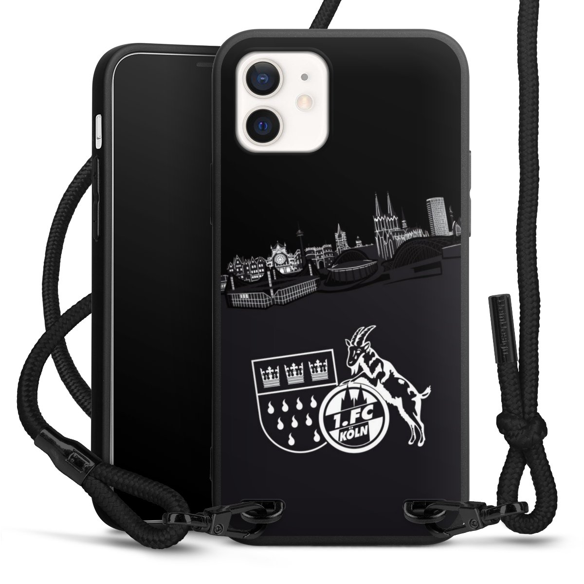 Pure Black: Handyhülle, Stoffband und Metalldetails in stylischem Mattschwarz.