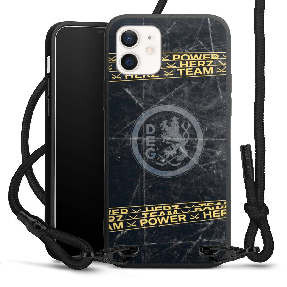 Pure Black: Handyhülle, Stoffband und Metalldetails in stylischem Mattschwarz.