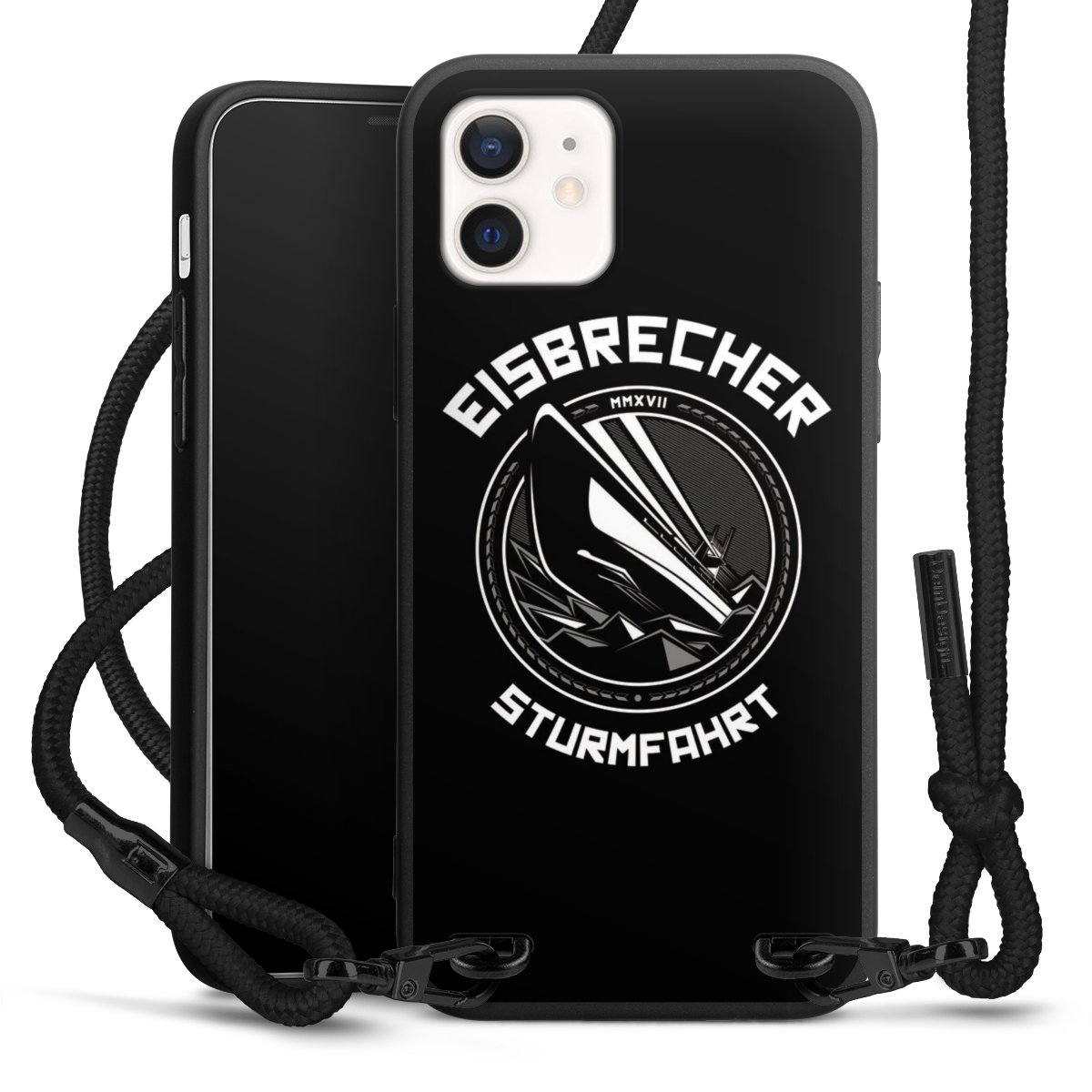 Pure Black: Handyhülle, Stoffband und Metalldetails in stylischem Mattschwarz.