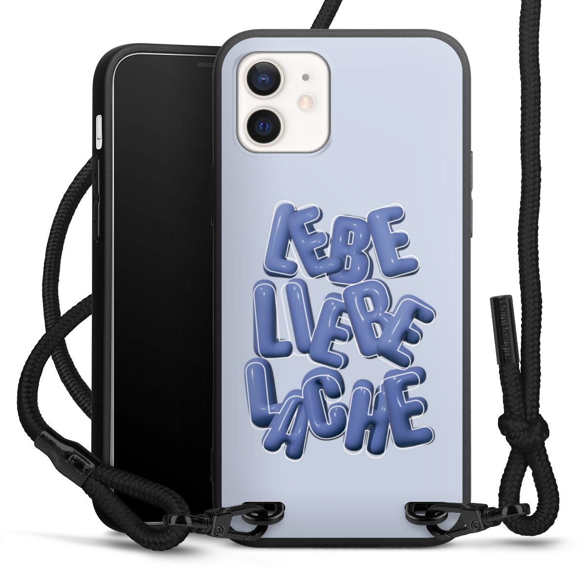 Pure Black: Handyhülle, Stoffband und Metalldetails in stylischem Mattschwarz.