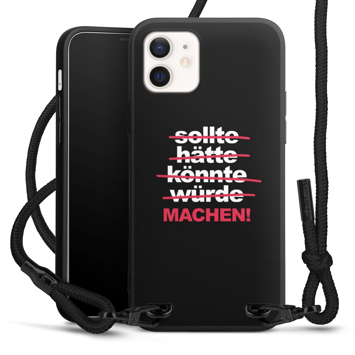 Pure Black: Handyhülle, Stoffband und Metalldetails in stylischem Mattschwarz.